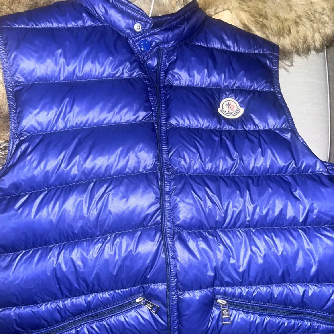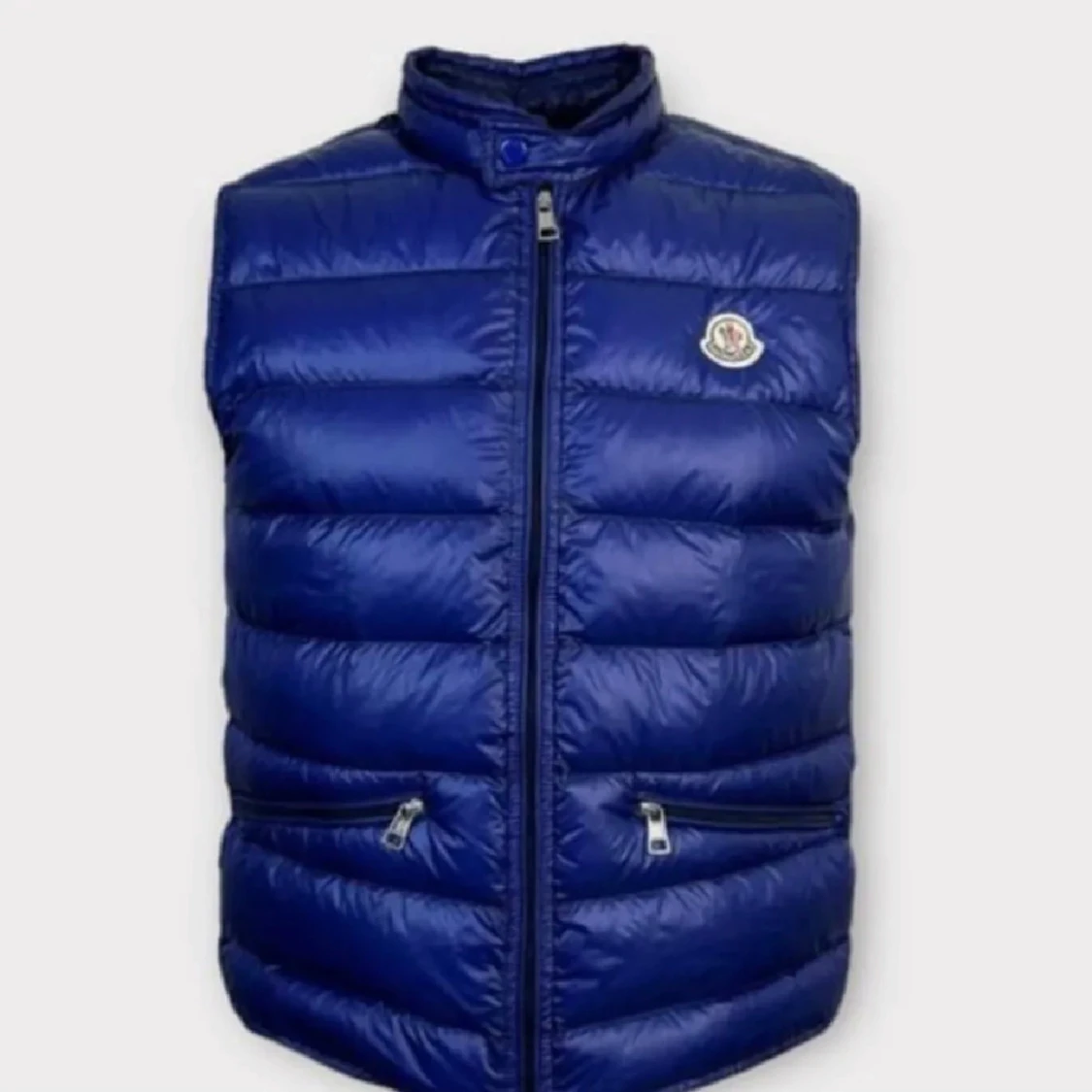Säljer en snygg blå dunväst från Moncler. Västen har en dragkedja framtill och två praktiska fickor med dragkedjor. Perfekt för kyligare dagar och ger en stilren look.