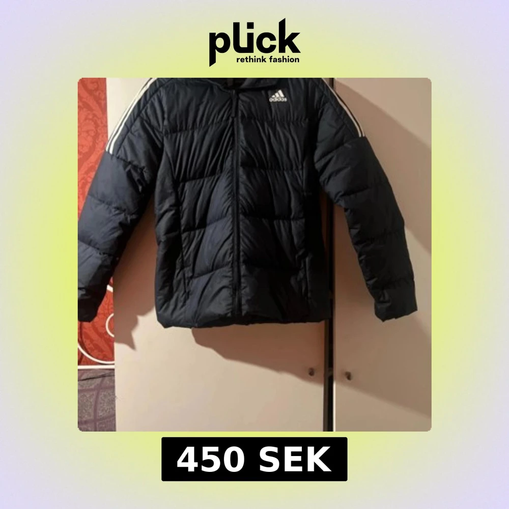 Snygg svart dunjacka från Adidas med vita ränder på ärmarna. Jackan har en dragkedja framtill och är perfekt för kyligare väder. Den har en sportig look med långärmade ärmar och en bekväm passform.användt bara 1 eller 2 gånger