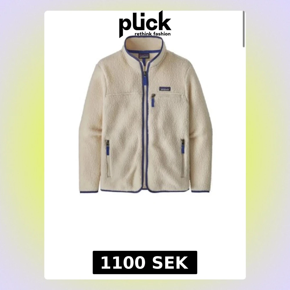 Säljer en cremevit Patagonia fleecejacka med blå detaljer. Köpt second hand men inga defekter utöver liten fläck på insidan.