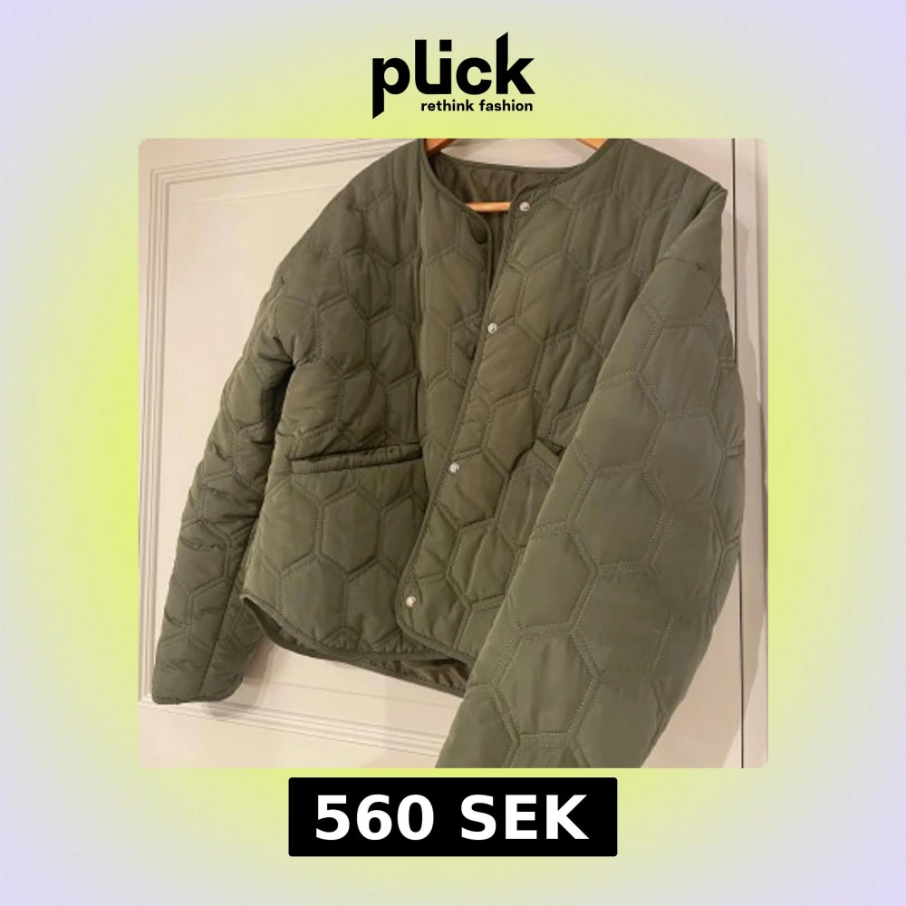 Säljer en olivgrön pufferjacka med coolt hexagonmönster. Jackan har rund halsringning, tryckknappar framtill och två stora fickor. Köpte den på Plick för typ ett år sedan, har inga lappar så vet tyvärr inte varifrån den är! Den har en liten lätt fläck på högra sidan som bara behöver tvättas lite snabbt, annars inga defekter alls och som ny!