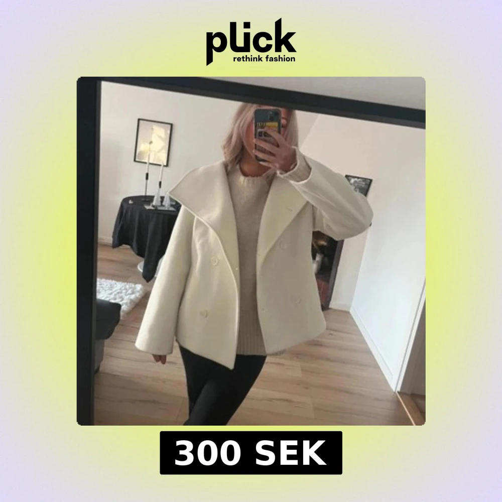 Säljer en stilren vit kappa med dubbelknäppning och bred krage. Jackan har en elegant och tidlös design som passar perfekt för kyligare dagar. Den är långärmad och har en klassisk passform.