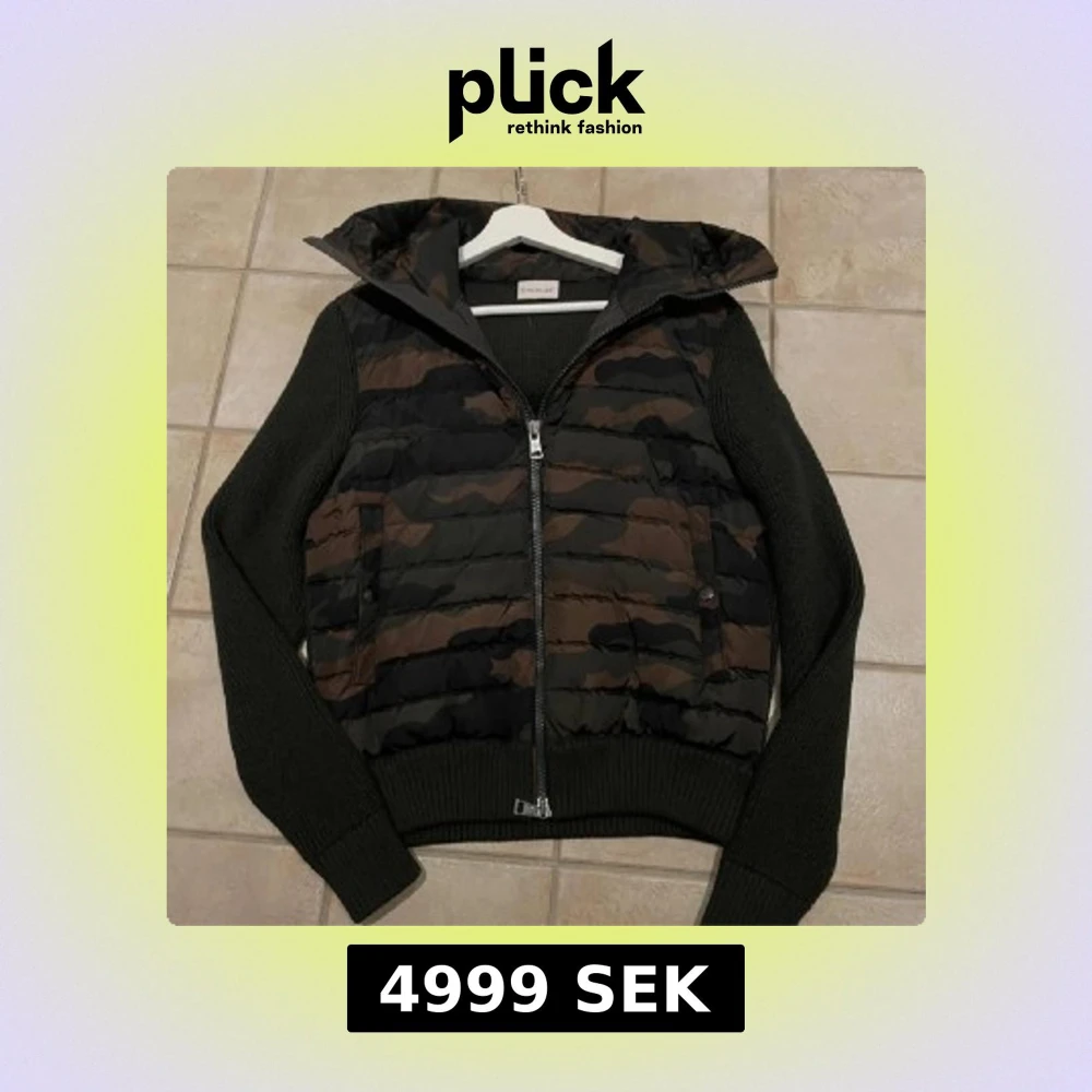 Snygg jacka från Moncler med camouflage-mönster och stickade ärmar. Jackan har en dragkedja framtill och en huva för extra skydd. Perfekt för en cool och avslappnad stil. jackan är en limiter edition jacka från Asien som bara Monclers högsta kunder kunnat köpa.
