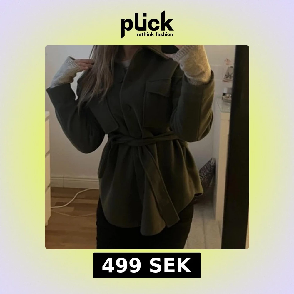 Snygg olivgrön kappa med bälte i midjan och stora knappar framtill. Jackan har långa ärmar och en klassisk krage, sååå fin, ingen defekt alls och har använts både vår och höst och är den perfekta jackan, men tyvärr så har jag tröttnat lite på den och köpt en ny :( . Sitter som en S ! sänker pris vid snabb affär 😻