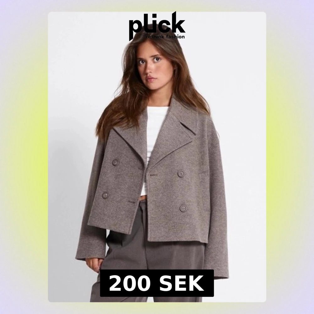 Säljer en beige rock med bred krage och dubbelknäppning. Jackan har en loose passform och långa ärmar, perfekt för dig som gillar en chill och stilren look. Passar bra över en hoodie och har en klassisk design med stora knappar framtill.