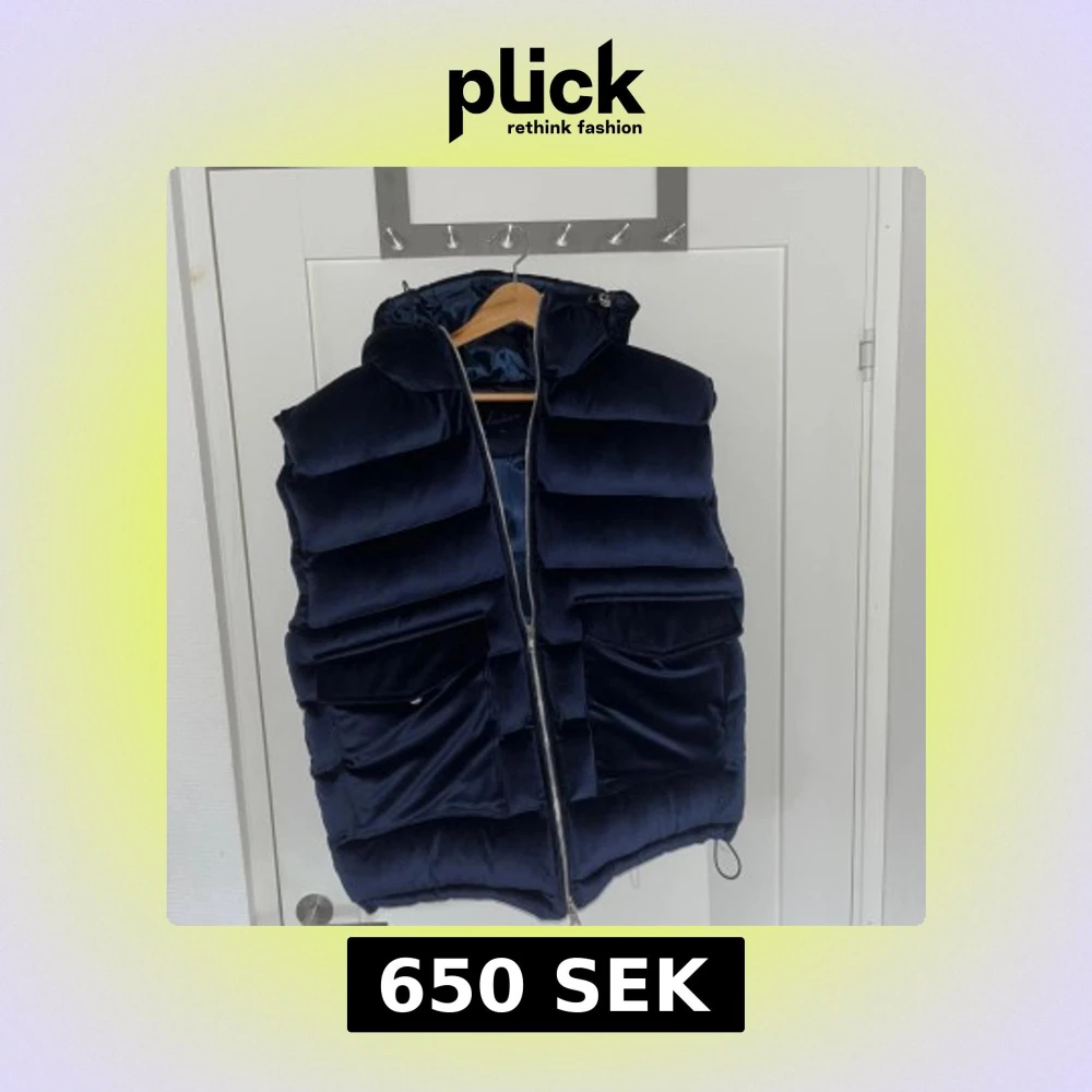 Snygg mörkblå dunväst från Vendiera med fluffig, quiltad design och stor huva. Västen har två stora fickor framtill och dragkedja hela vägen. Materialet är mjukt och har en lyxig känsla, perfekt för att hålla värmen under kyliga dagar