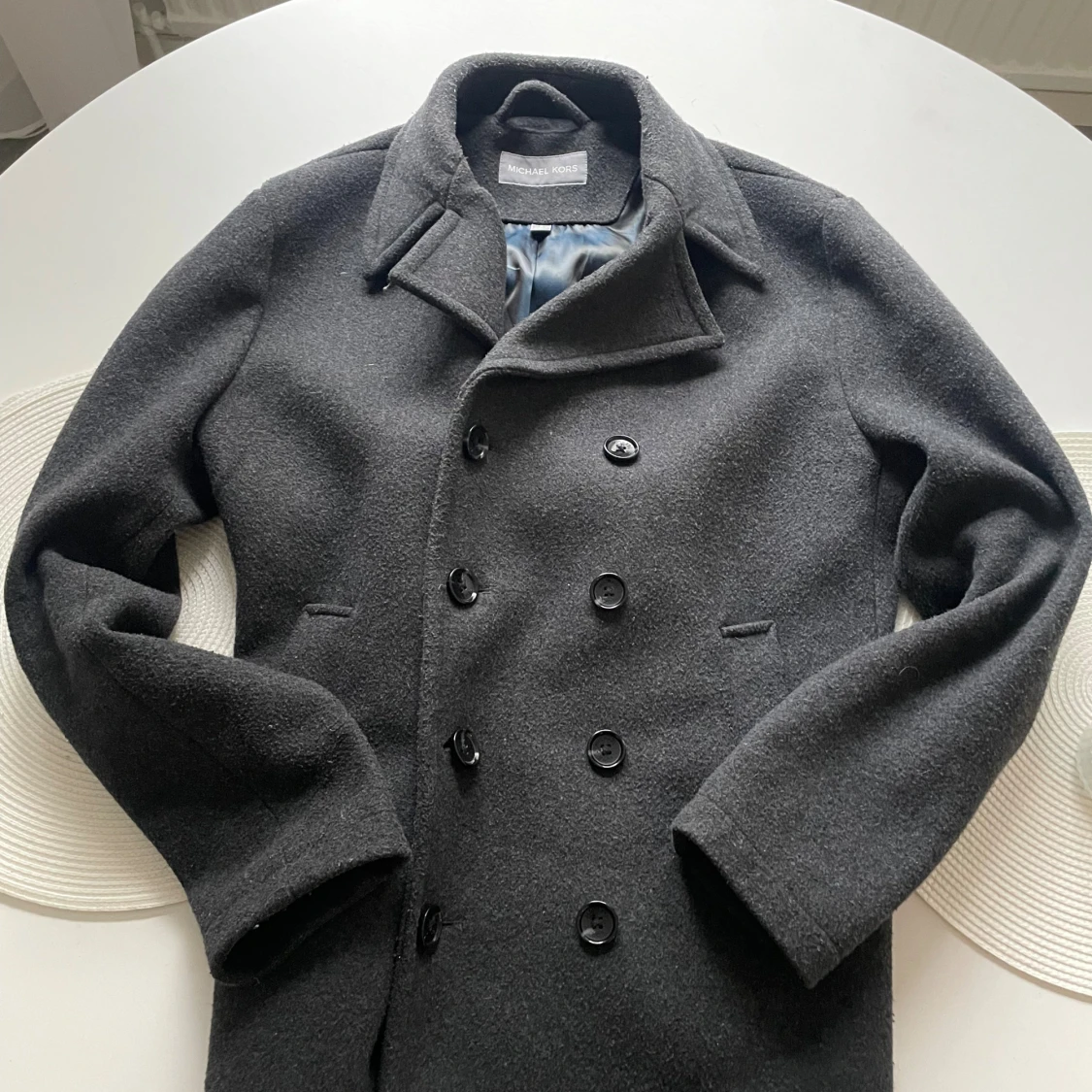 Stilren mörkgrå skepparkavaj från Michael Kors i stretchig ullblandning. Jackan har dubbelknäppning med svarta knappar, klassisk krage och två fickor framtill. Perfekt för dig som vill ha en tidlös och snygg look under höst och vinter. S men passar M