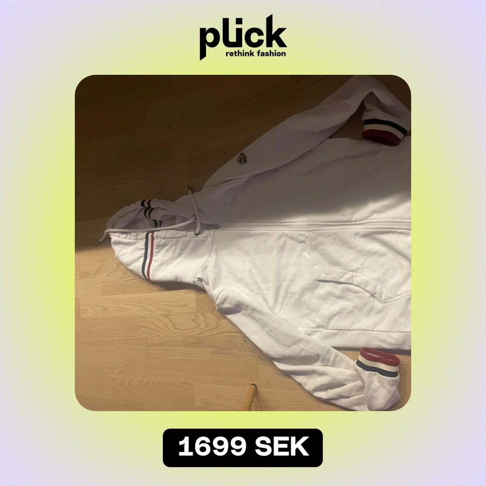 Säljer en snygg vit huvtröja från Moncler i mycket bra skick. Den har en dragkedja framtill och ribbade muddar med ränder i blått och rött. Perfekt för höst och vår, med en stilren design och Moncler-logga på ärmen. Passar både till vardags och lite finare tillfällen.