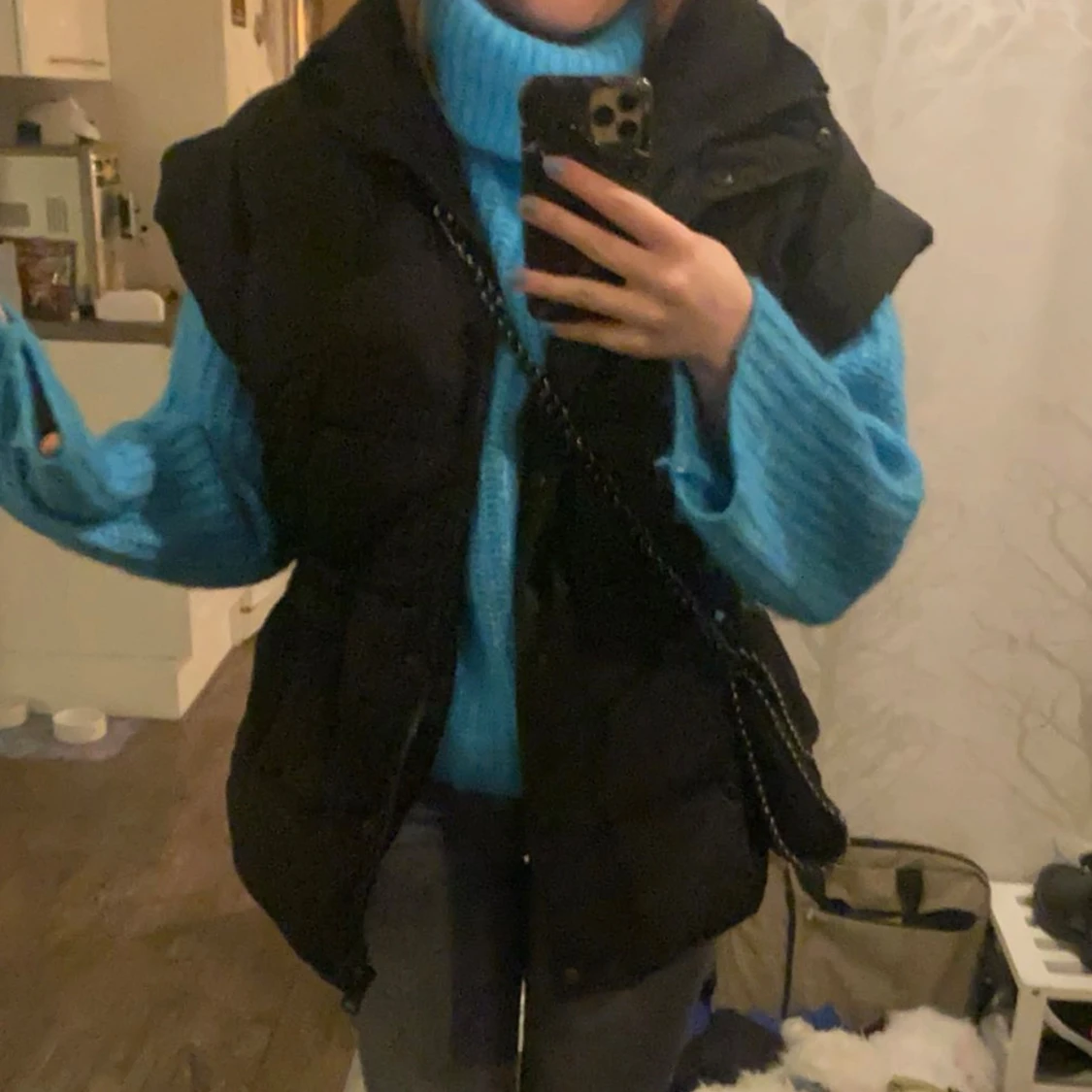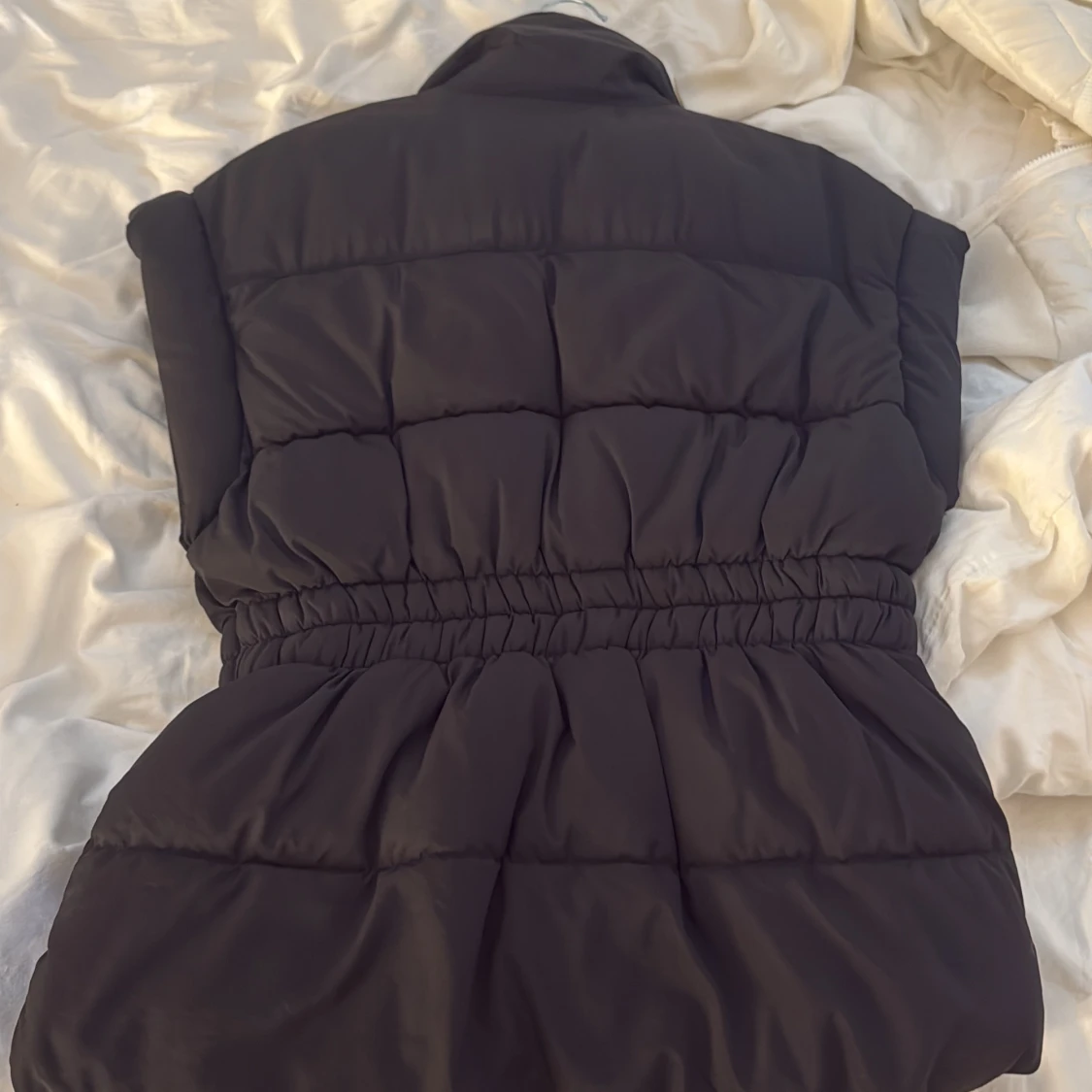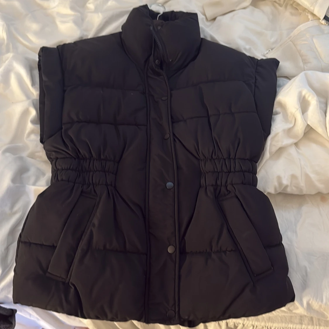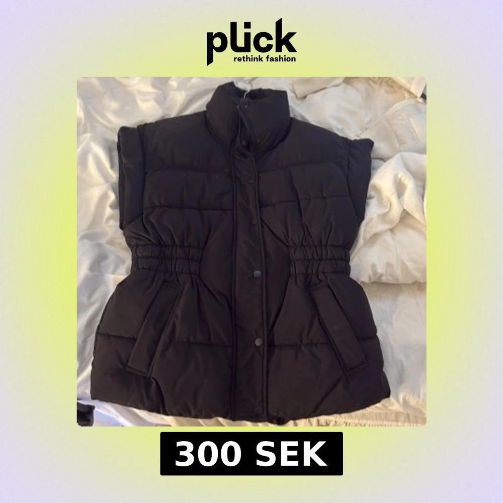 Svart dunväst med quiltad design och hög krage. Västen har elastisk midja som ger en snygg form, tryckknappar framtill och två fickor. Perfekt att slänga över en stickad tröja för extra värme. Stilsäker och enkel att matcha.