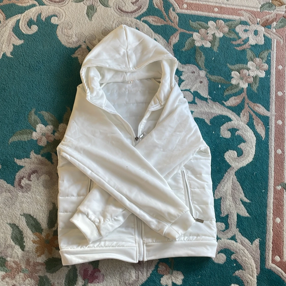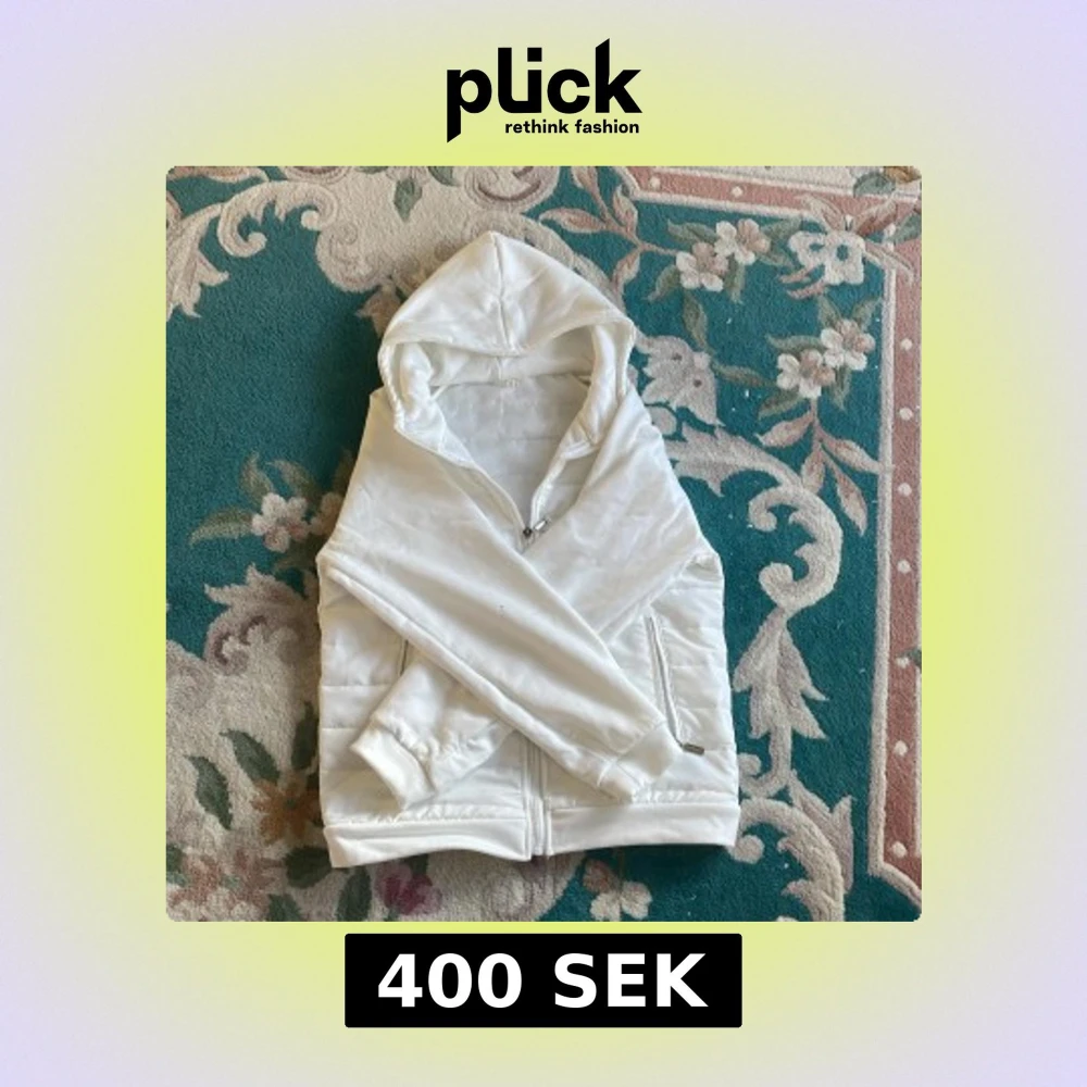Säljer en stilren vit cardigan med dragkedja och huva. Jackan har långa ärmar och ribbade muddar vid ärmslut och nederkant. Perfekt för en avslappnad look. Skriv ifall du har frågor eller för mer bilder!🙌🏻