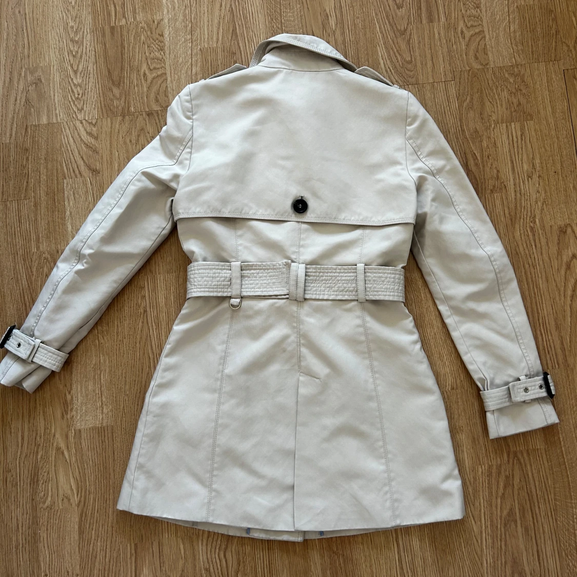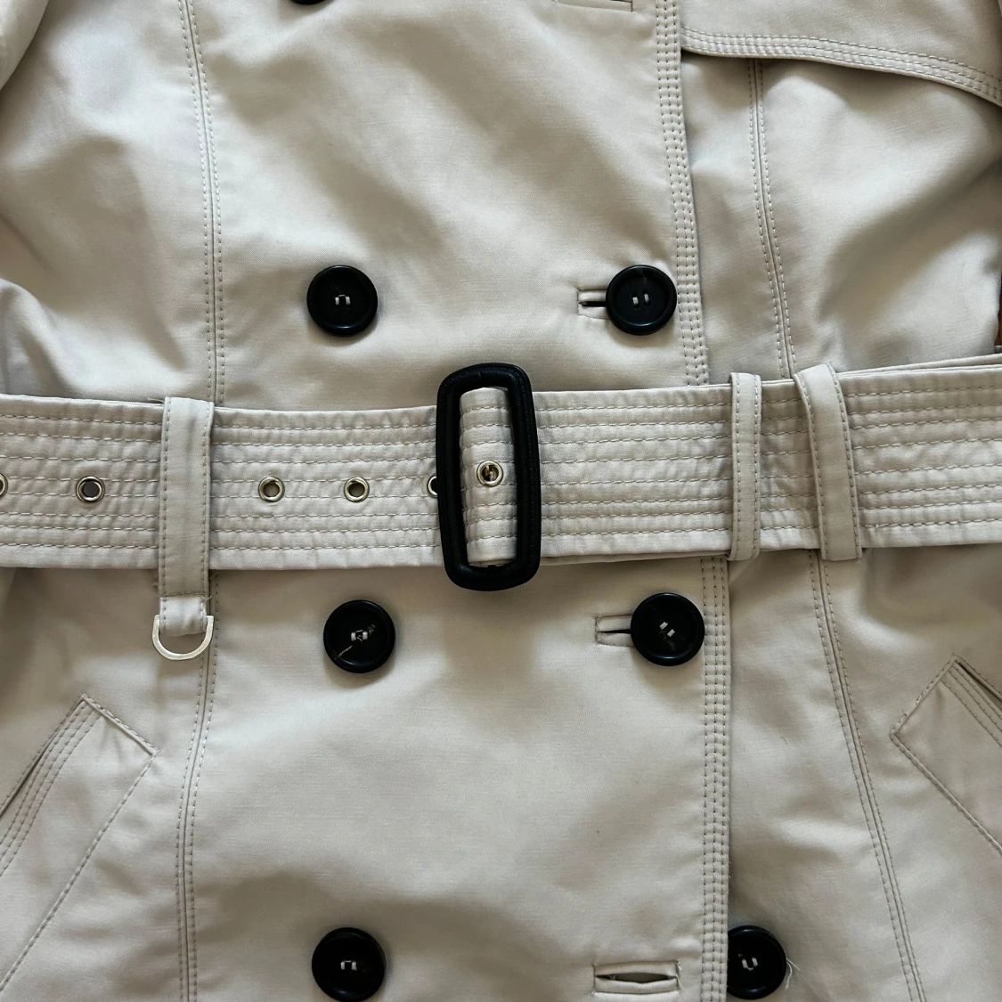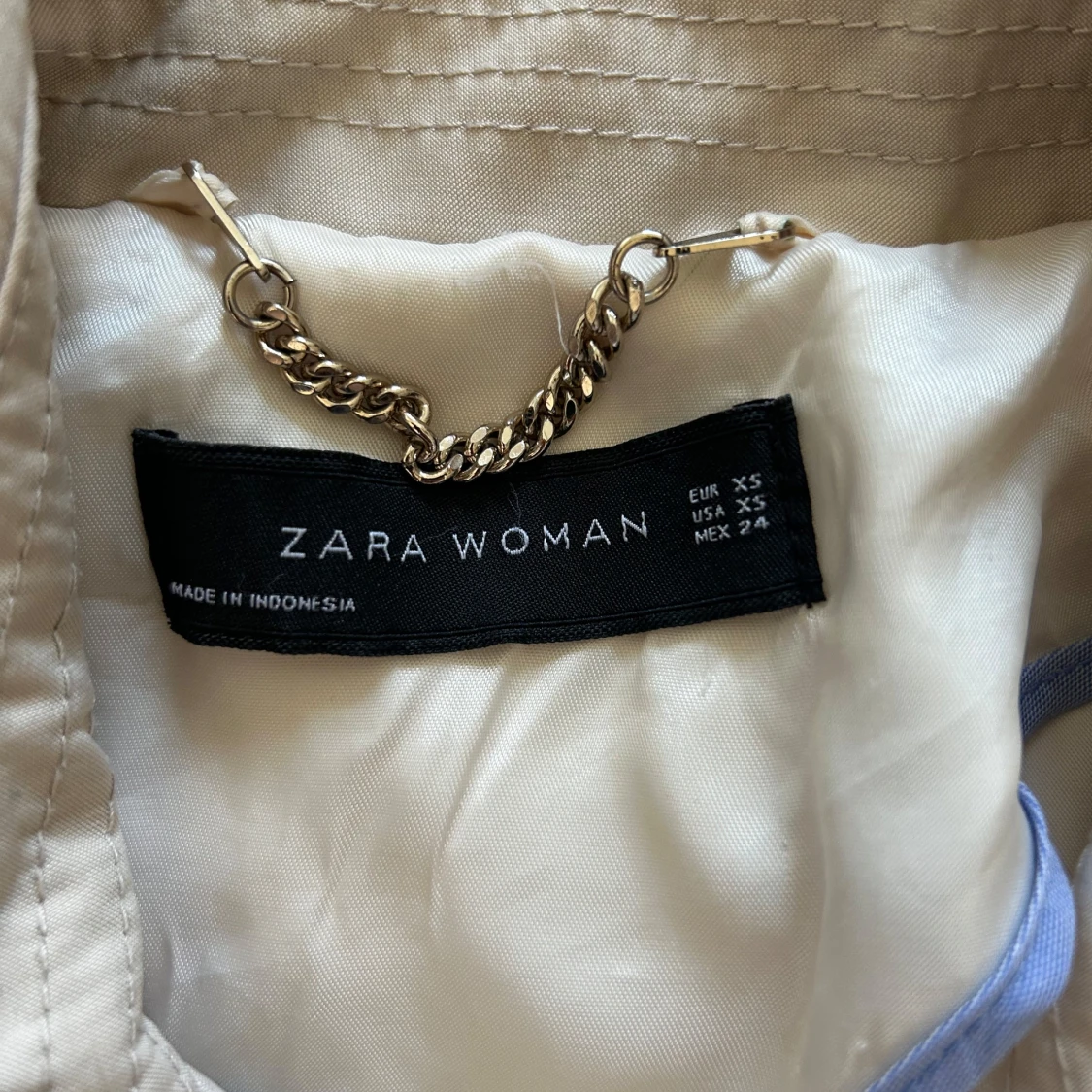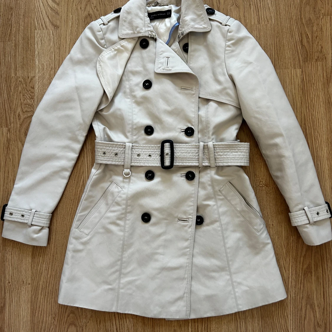 Säljer en klassisk beige trenchcoat från Zara Woman med dubbelknäppning, bälte i midjan och svarta knappar. Jackan har långa ärmar, axelklaffar och snygga detaljer vid ärmslut och axlar. Perfekt för en stilren look. Väldigt fint skick dock har sömmen gått upp på insidan.
