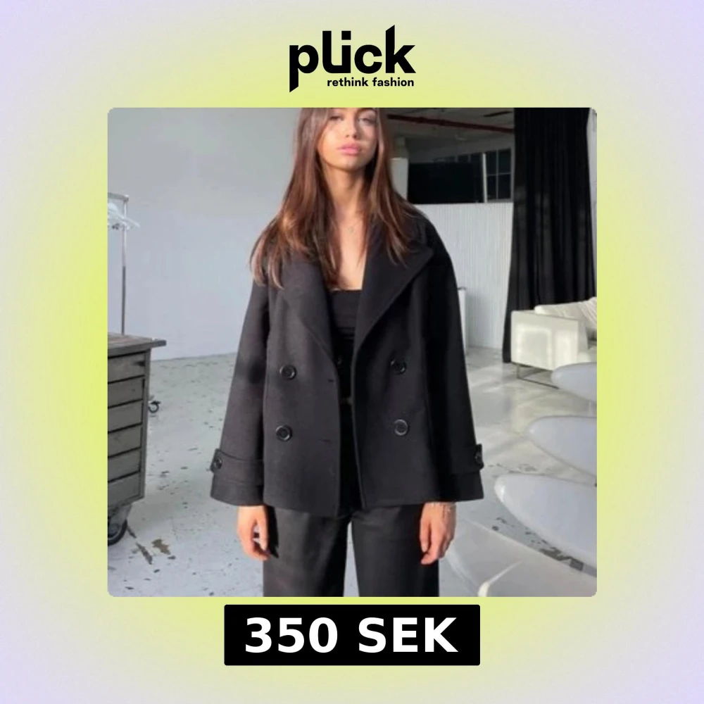 Snygg svart kappa med dubbelknäppning och breda slag. Jackan har en klassisk design med långa ärmar och en lös passform. Perfekt för en stilren look. Enda defekten är att den saknar en knapp vid ärmarna annars är den som ny