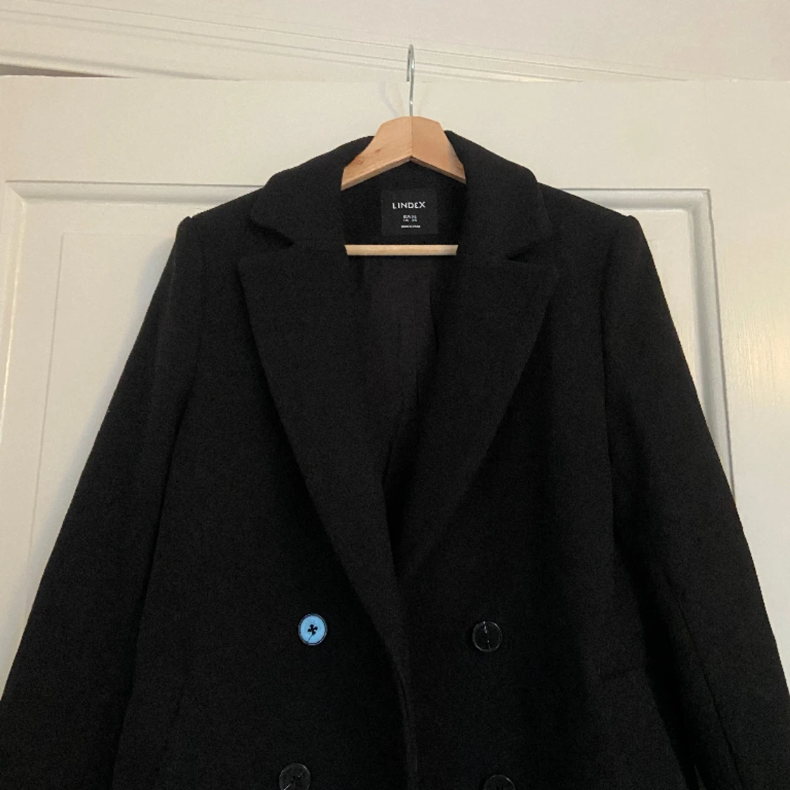Svart kappa från Lindex i ullblandning. Dubbelknäppning med slits bak. Helt ny, aldrig använd! Säljer då den tyvärr inte kommit till användning. Nypris 1499kr.