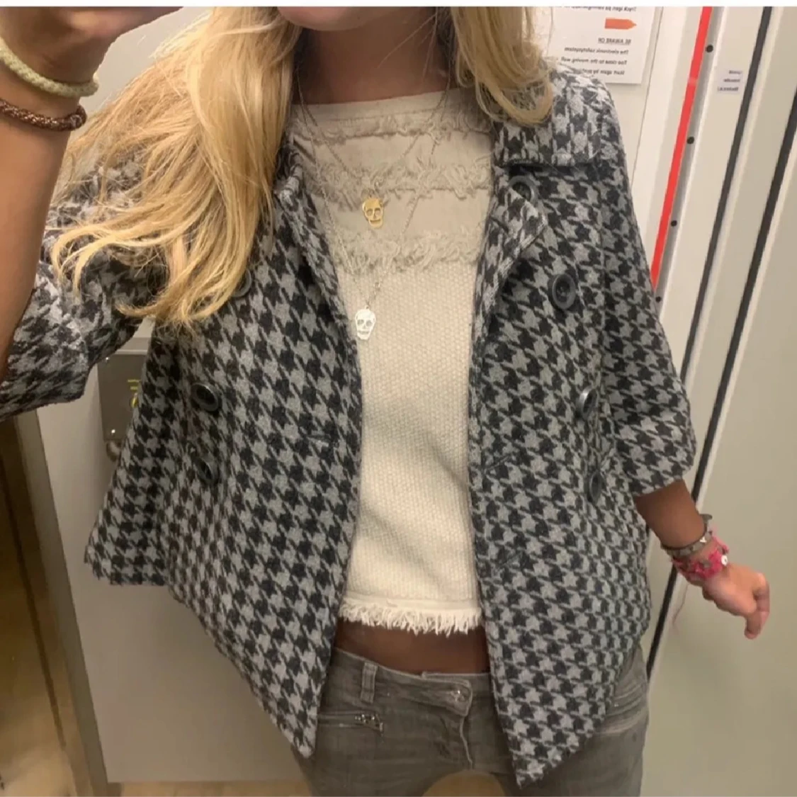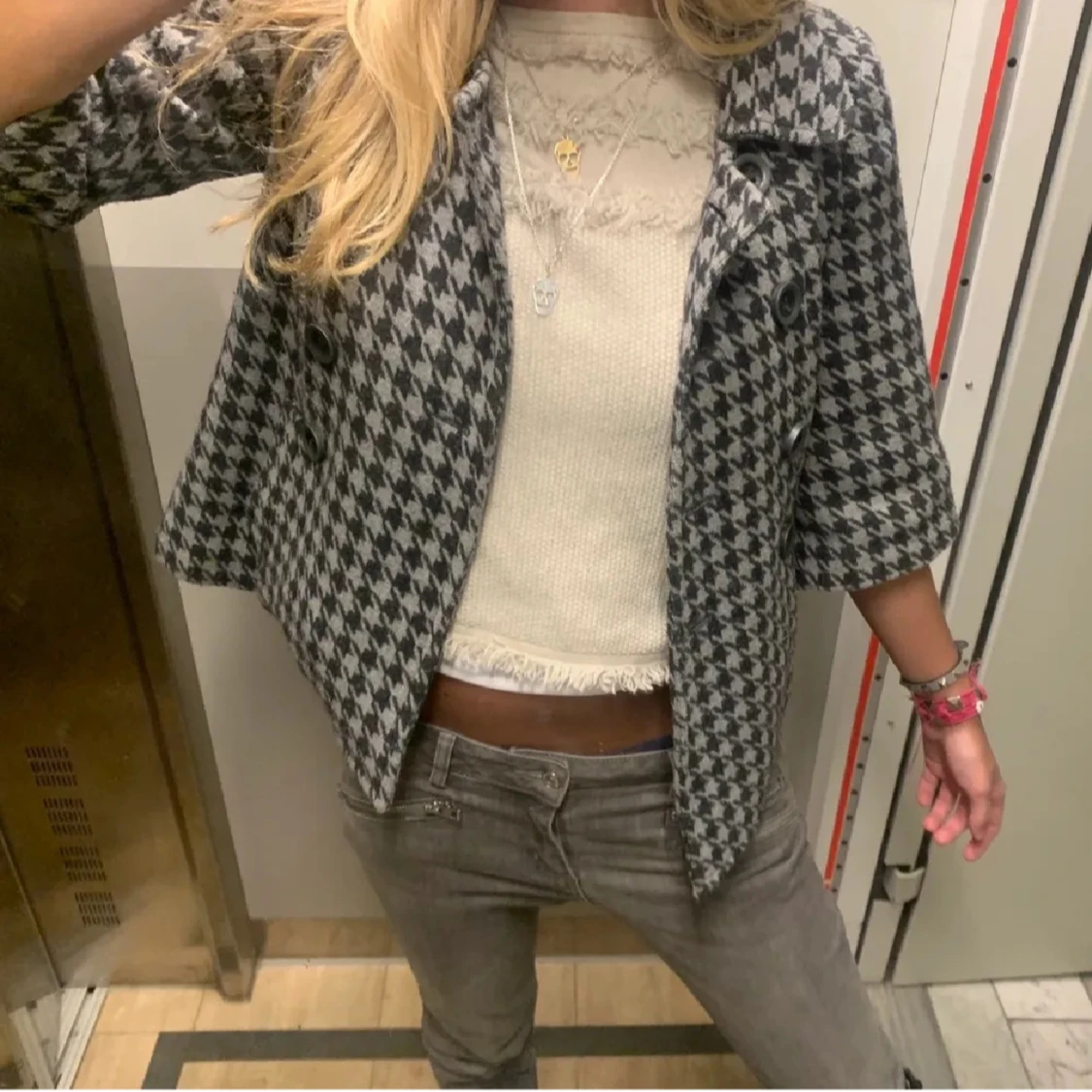 Säljer en snygg grå och svart rutig kappa med stora knappar och trekvartsärmar. Jackan har en klassisk krage och är i en kortare modell som ger en trendig look. Perfekt för dig som vill sticka ut med ett tidlöst mönster.