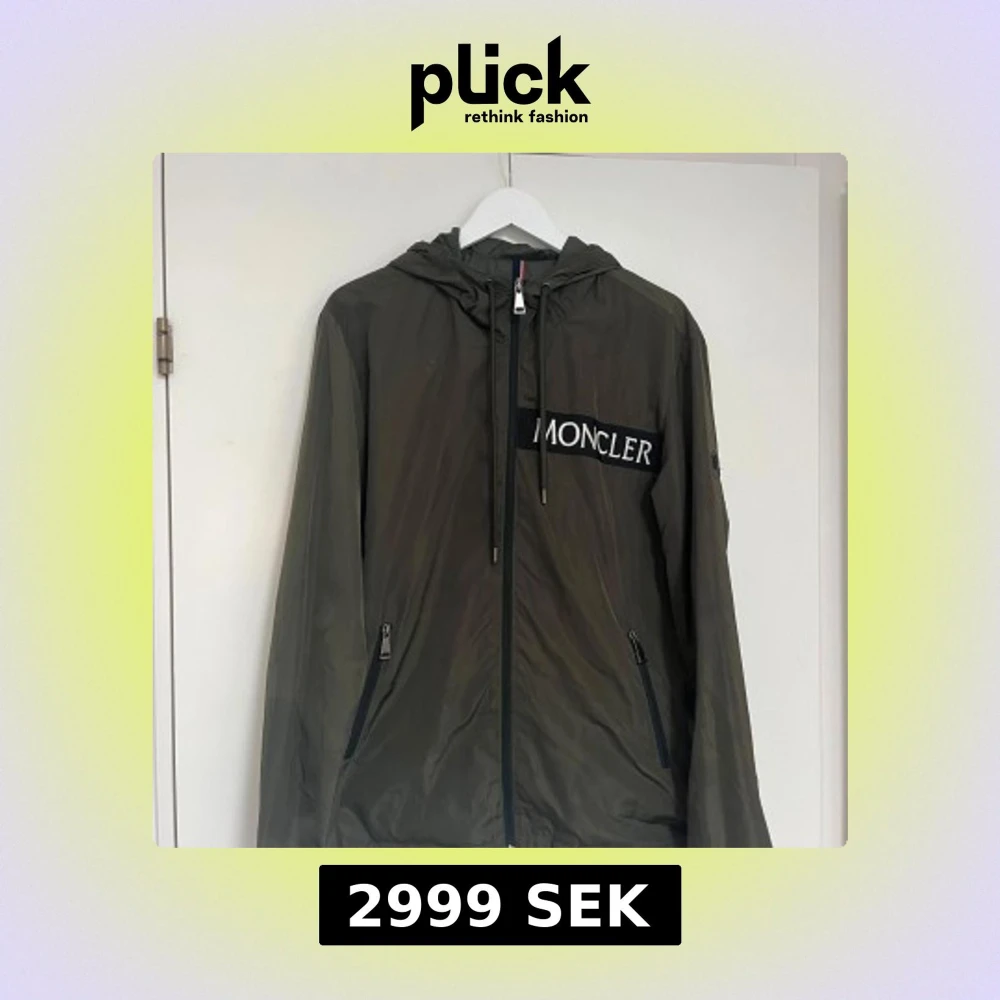 Säljer en snygg grön vindjacka från Moncler med dragkedja och huva. Jackan har Moncler-logga på bröstet och en cool serietidningsdetalj på insidan. Perfekt för höst och vår! Storlek L men passar M också.