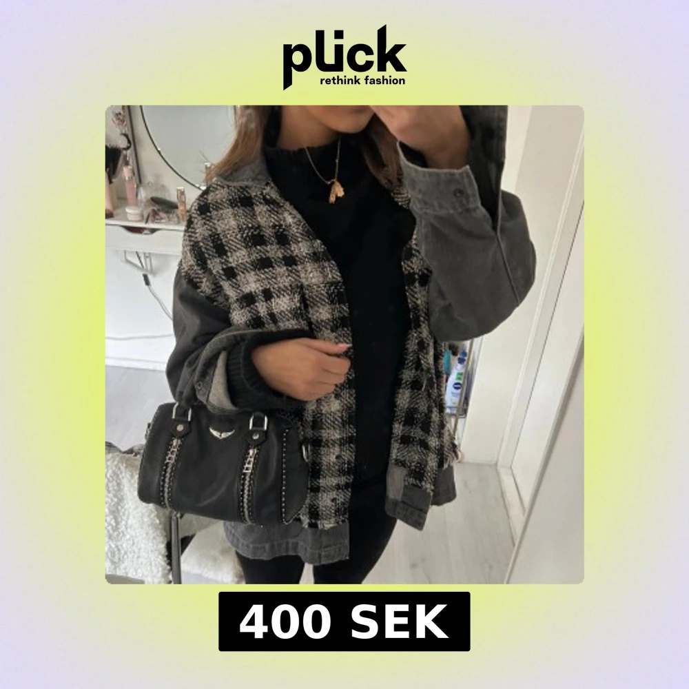 Trendig svart och vit rutig jeansjacka med oversized passform. Jackan har långa ärmar i grå denim. Aldrig använd