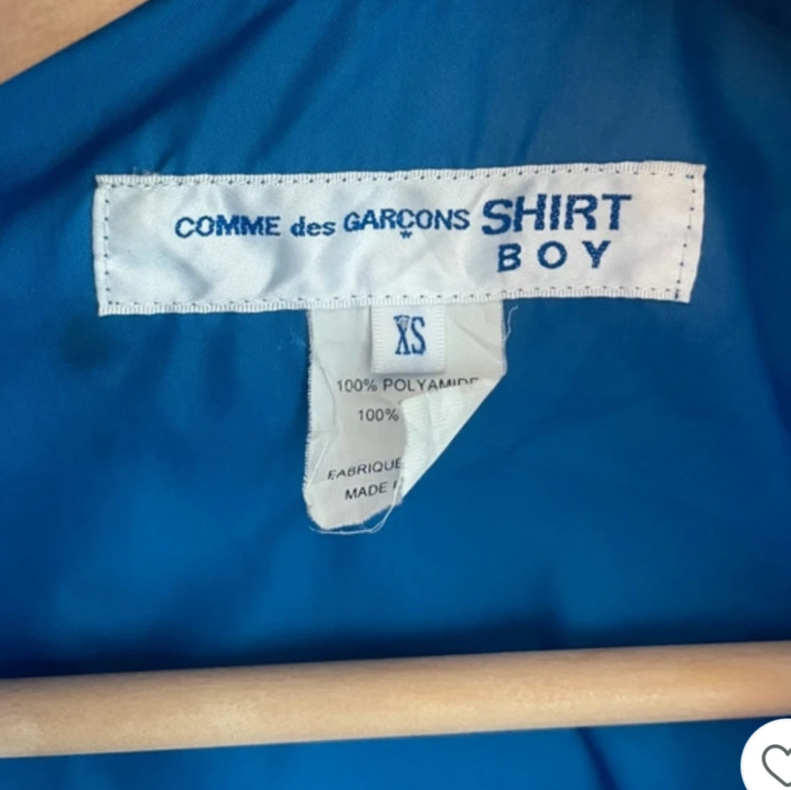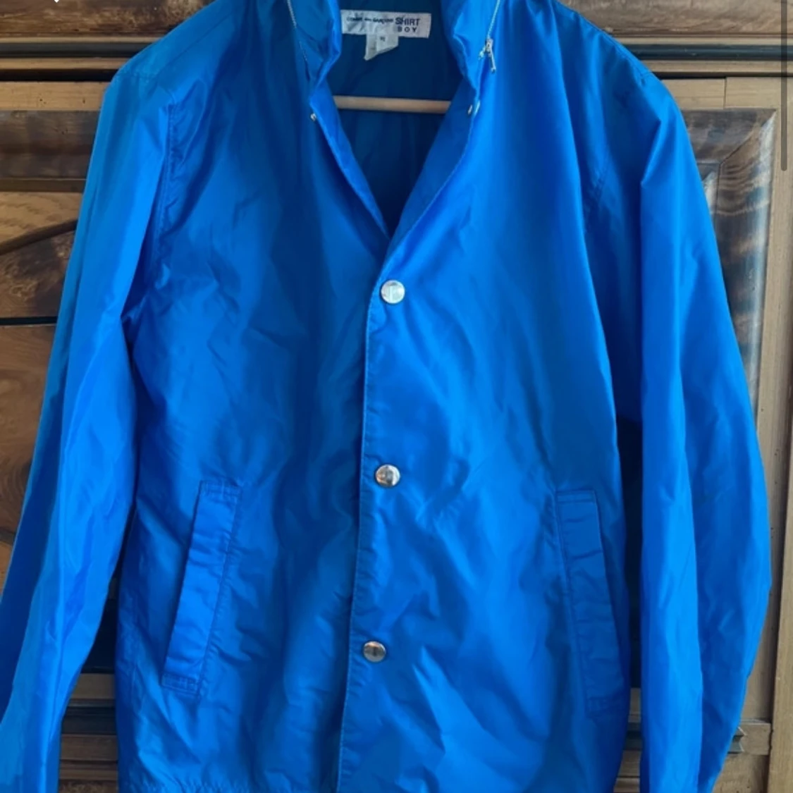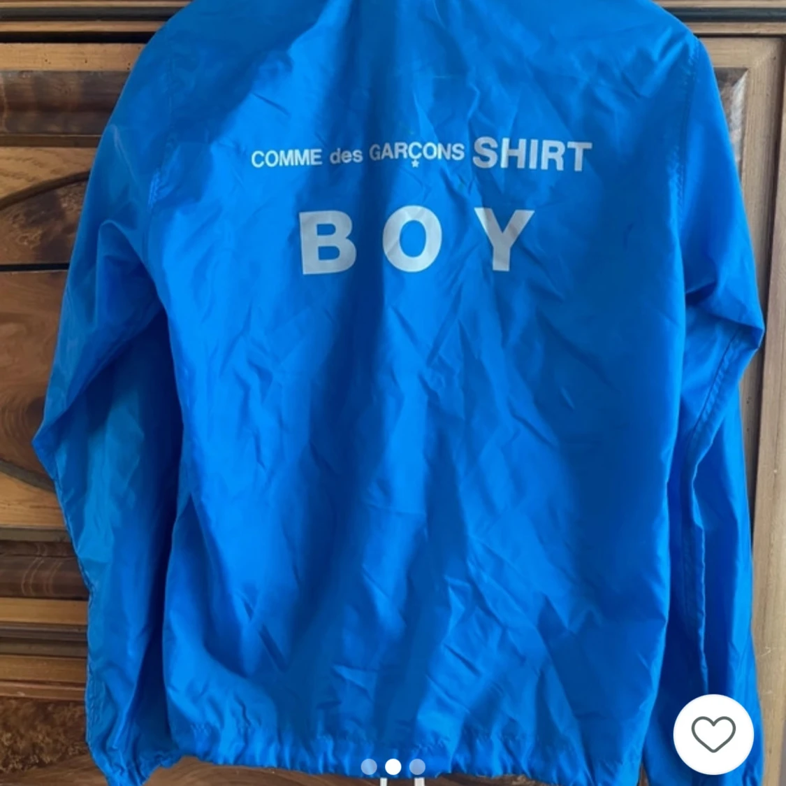 Säljer en blå vindjacka från Comme des Garçons. Jackan har huva, knappar framtill och fickor på sidorna. Stor logga i vitt på ryggen. Tillverkad i 100% polyamid, perfekt för dig som gillar streetwear och vill sticka ut. Nypris ligger på runt 3000kr. Inga defekter. Perfekt nu till sommaren. Pris ej hugget i sten