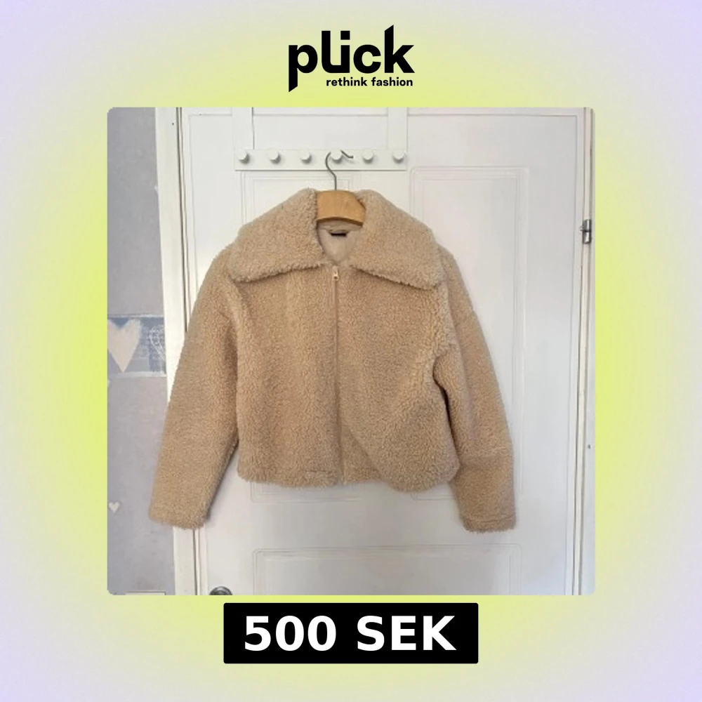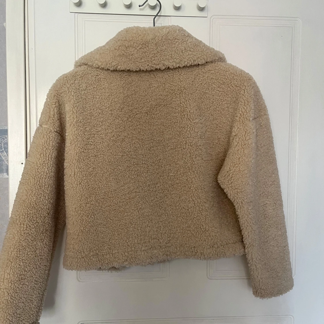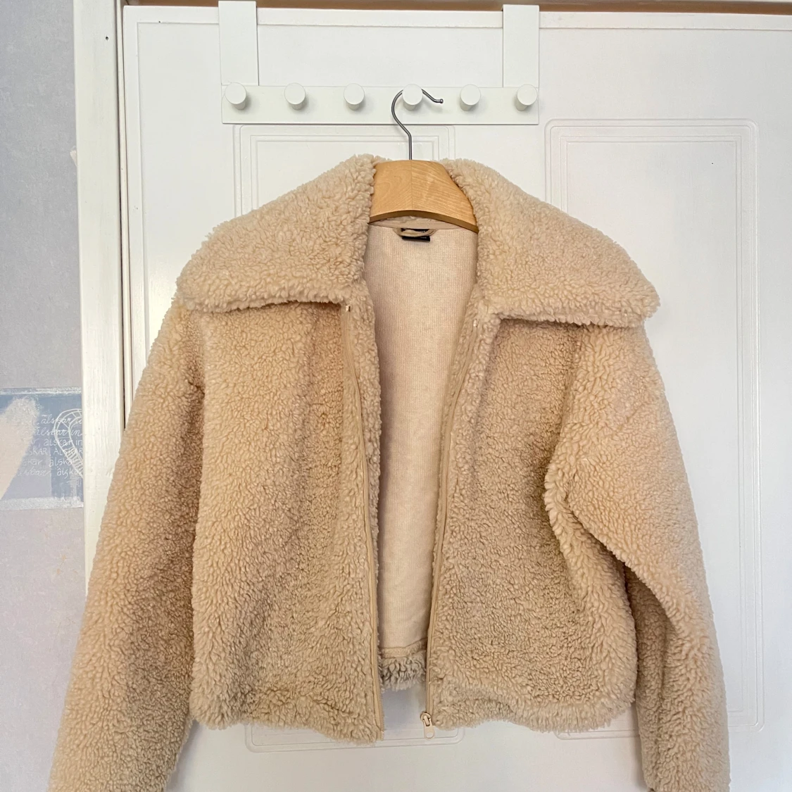 Mysig beige teddyjacka med stor krage och dragkedja framtill. Jackan är croppad och har lång ärm, perfekt för att hålla värmen under kyliga dagar. Passformen är normal och materialet är mjukt och fluffigt.
