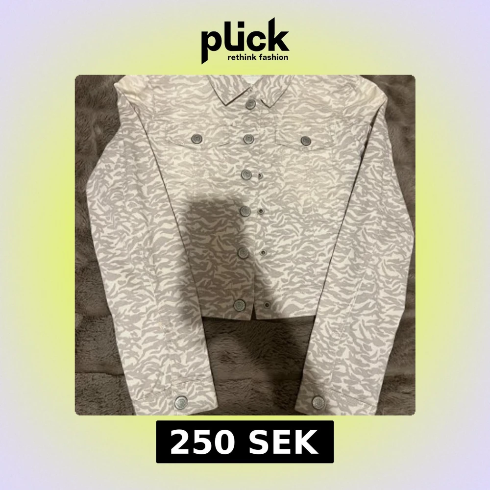 Snygg beige jeansjacka med ljusgrått zebramönster och klassisk krage. Jackan har knäppning framtill, två bröstfickor med knappar och långa ärmar. Perfekt för dig som vill sticka ut med en unik look.