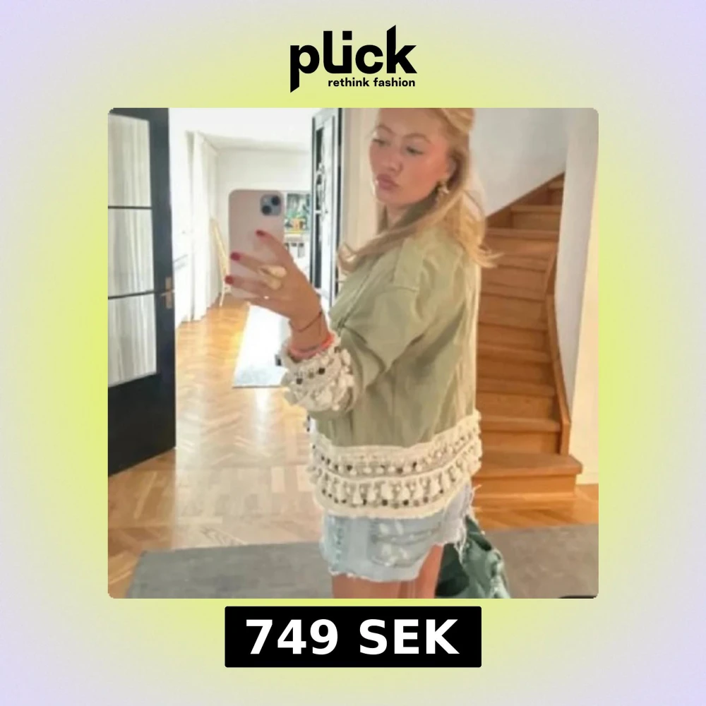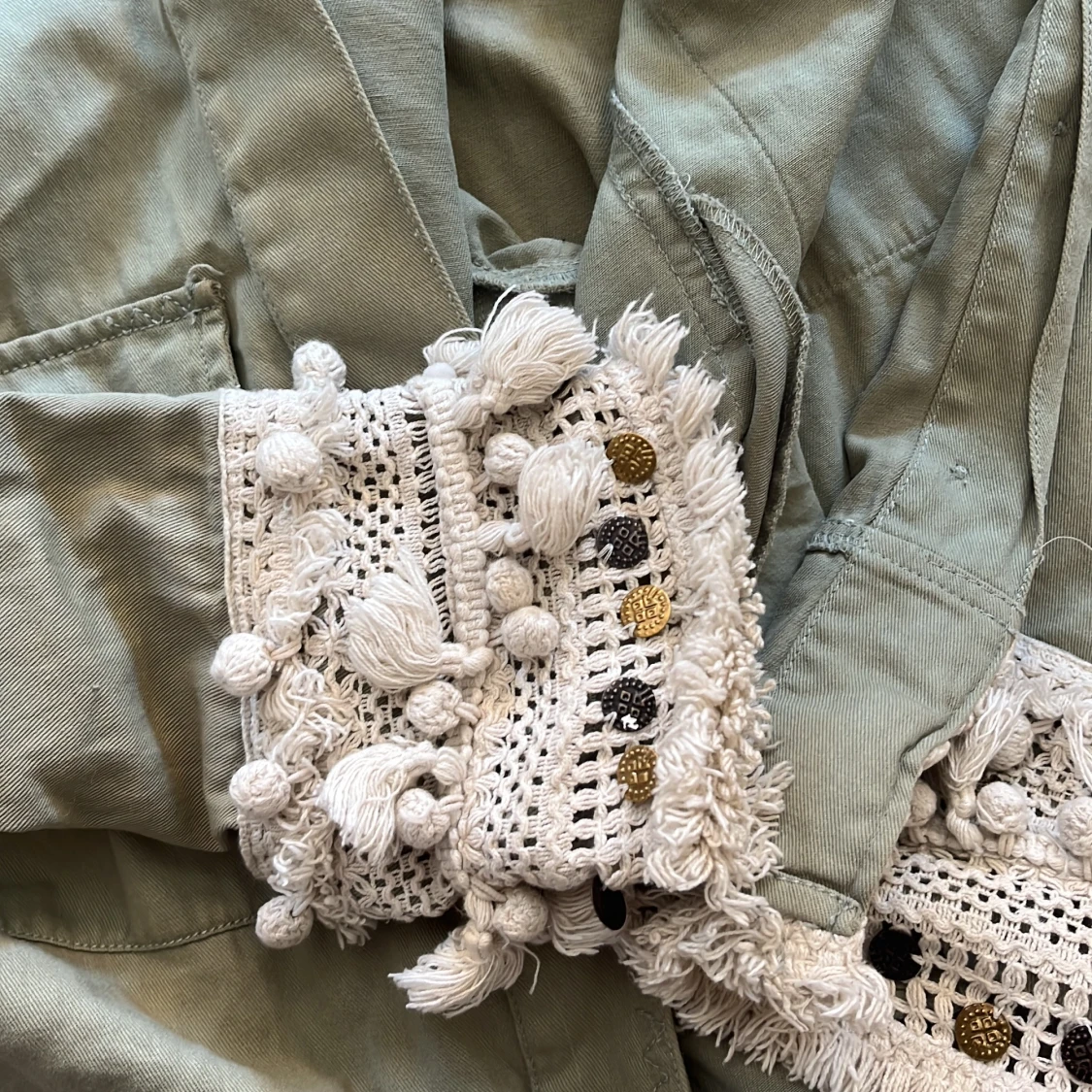 Säljer en superfin grön jacka med vita fransar. Jackan har knappar framtill och är långärmad. Perfekt för både höst och vår!