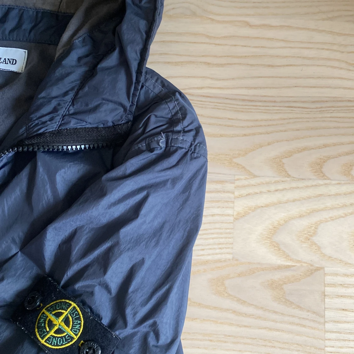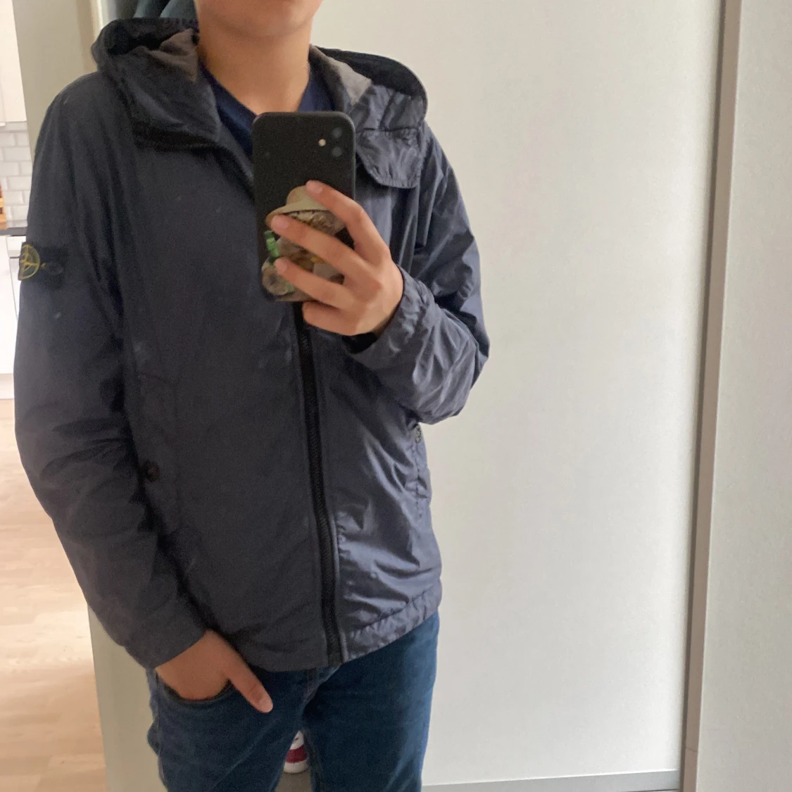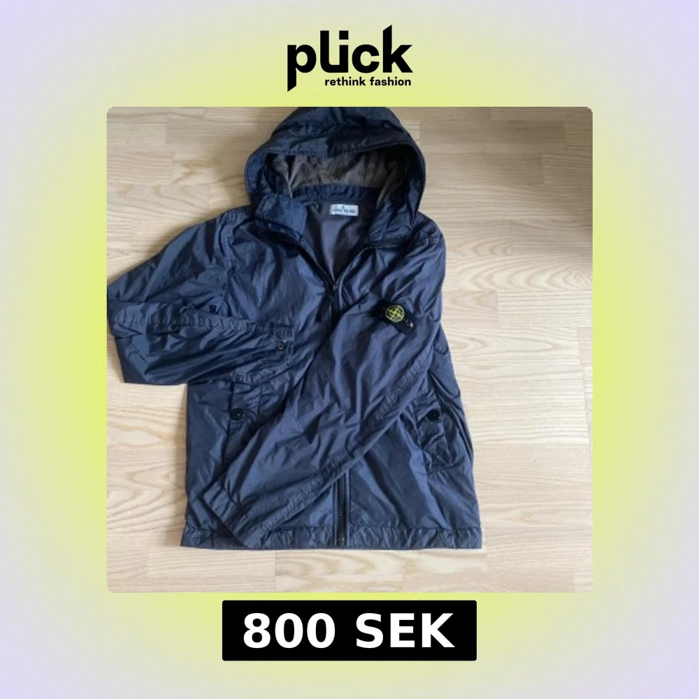 Säljer en grå vindjacka från Stone Island med huva och dragkedja. Tröjan kostar 4700 och är köpt från NK, killen på bilden är typ 170 och den sitter bra. Jackan är i bra skick bara två super små mini jack som ni ser på bild 3 och 4. Hör av er vid minsta fundering