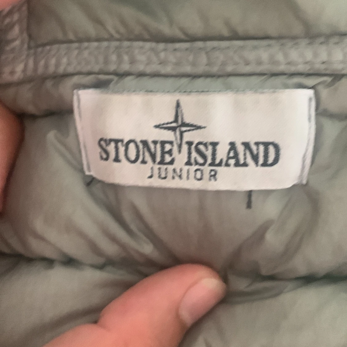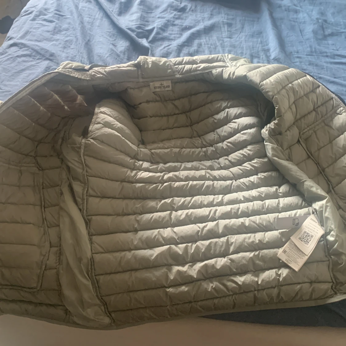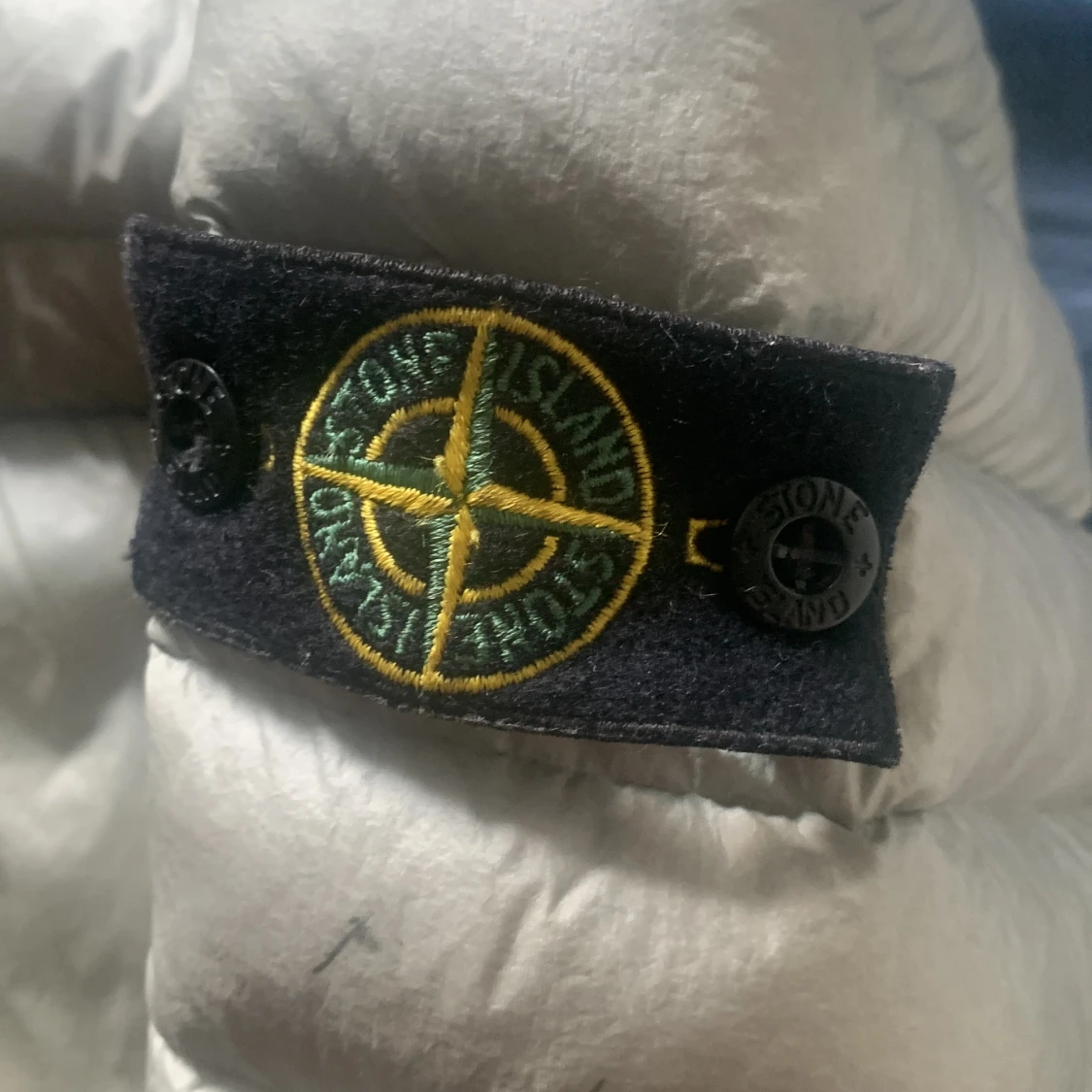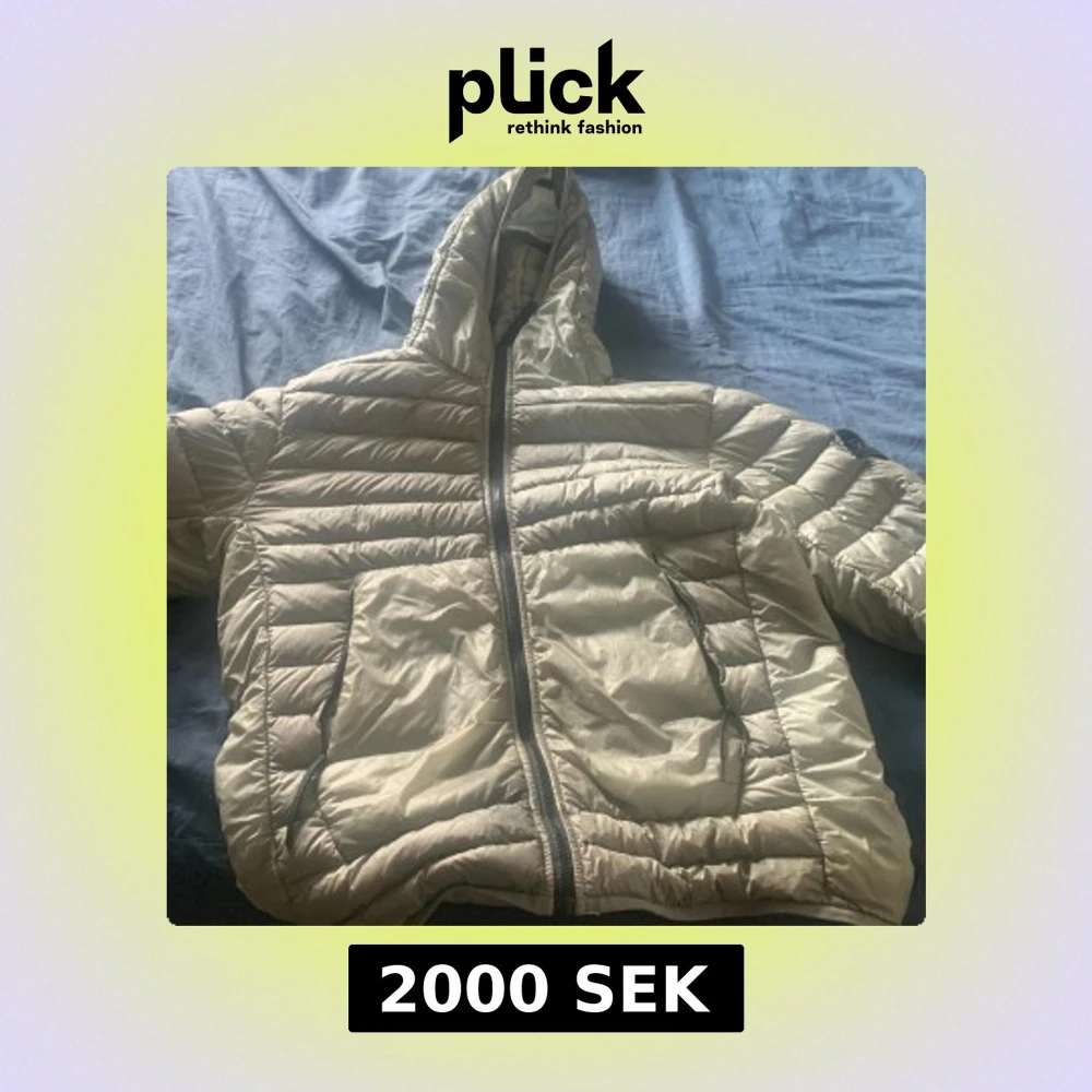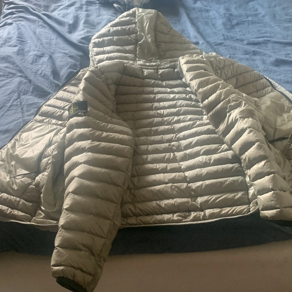 Säljer en beige dunjacka från Stone Island med huva och klassisk patch på ärmen. Jackan har horisontella sömmar, två stora fickor framtill och dragkedja hela vägen. Perfekt för kalla dagar och riktigt snygg streetstil.