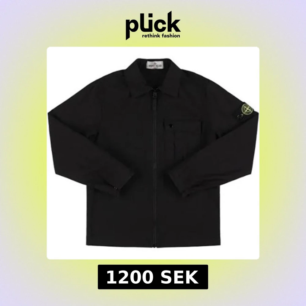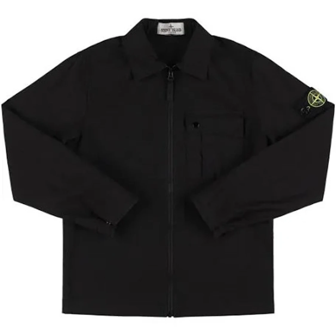 Svart overshirt från Stone Island med klassisk krage, dragkedja framtill och bröstficka. Ikonisk logotyp på vänster ärm. Perfekt för lager-på-lager och stilren streetwear-look.