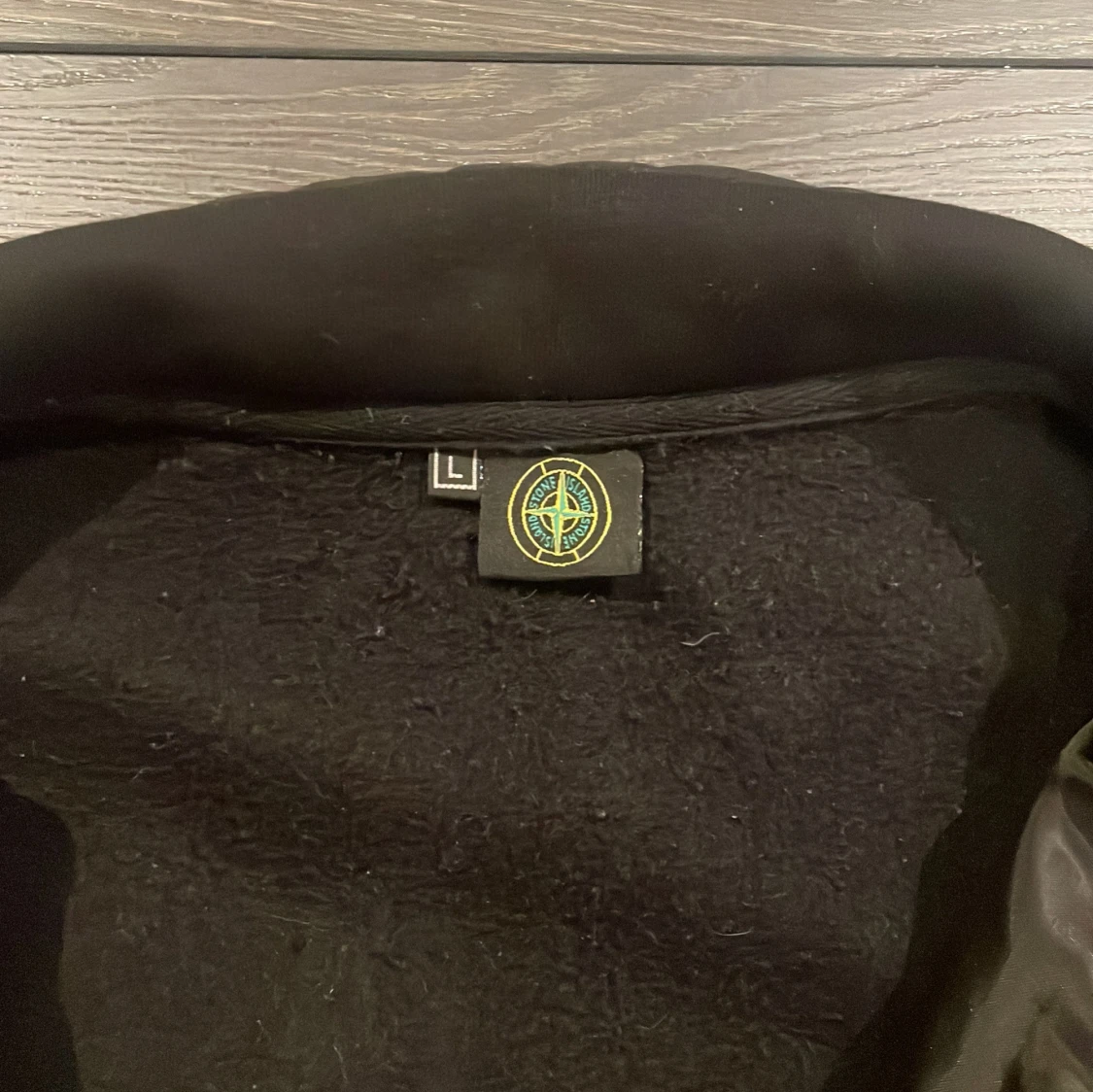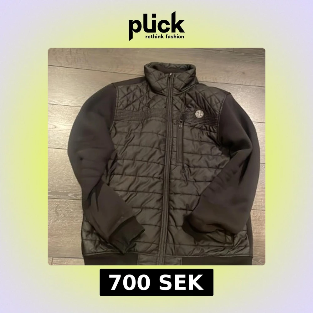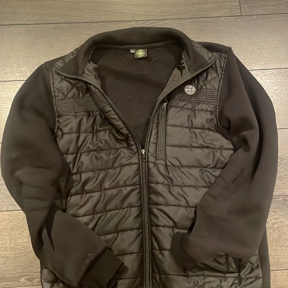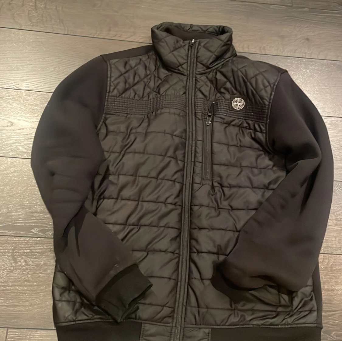Svart quiltad jacka från Stone Island med hög krage och dragkedja framtill. Jackan har en bröstficka med dragkedja, ribbade muddar och diskret logga på bröstet. Den är fin och brakvalite och är fräsch utan några fläckar och hål