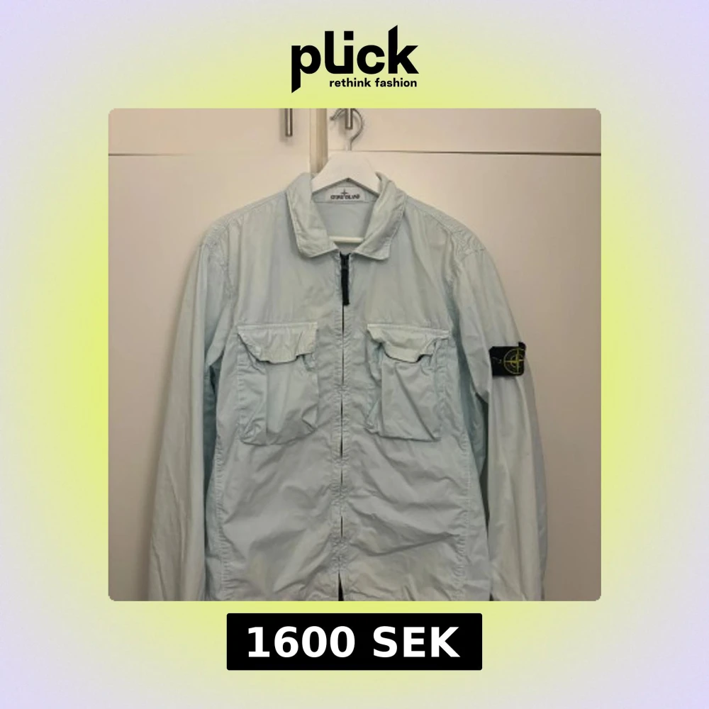 Säljer en stilren ljusblå overshirt från Stone Island med dragkedja och två bröstfickor. Den har långa ärmar och en klassisk krage. Perfekt för lager-på-lager-stil.