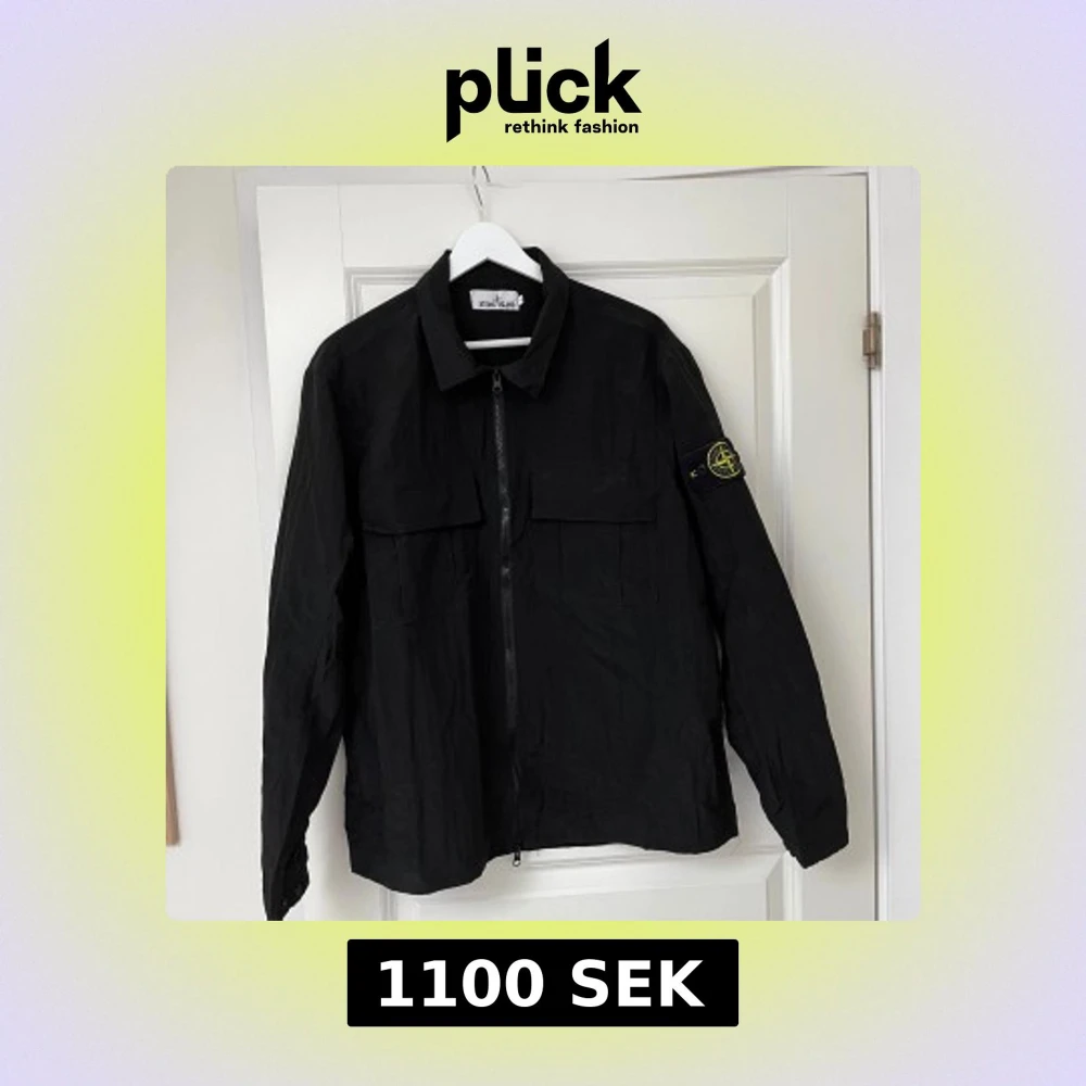 Svart overshirt från Stone Island med klassisk krage, två stora bröstfickor och dragkedja framtill. Ikonisk logga på vänster ärm. Lätt och stilren jacka i syntetmaterial, perfekt för lager-på-lager och streetwear-vibe. Använd 4-5 gånger. Nypris 2999.