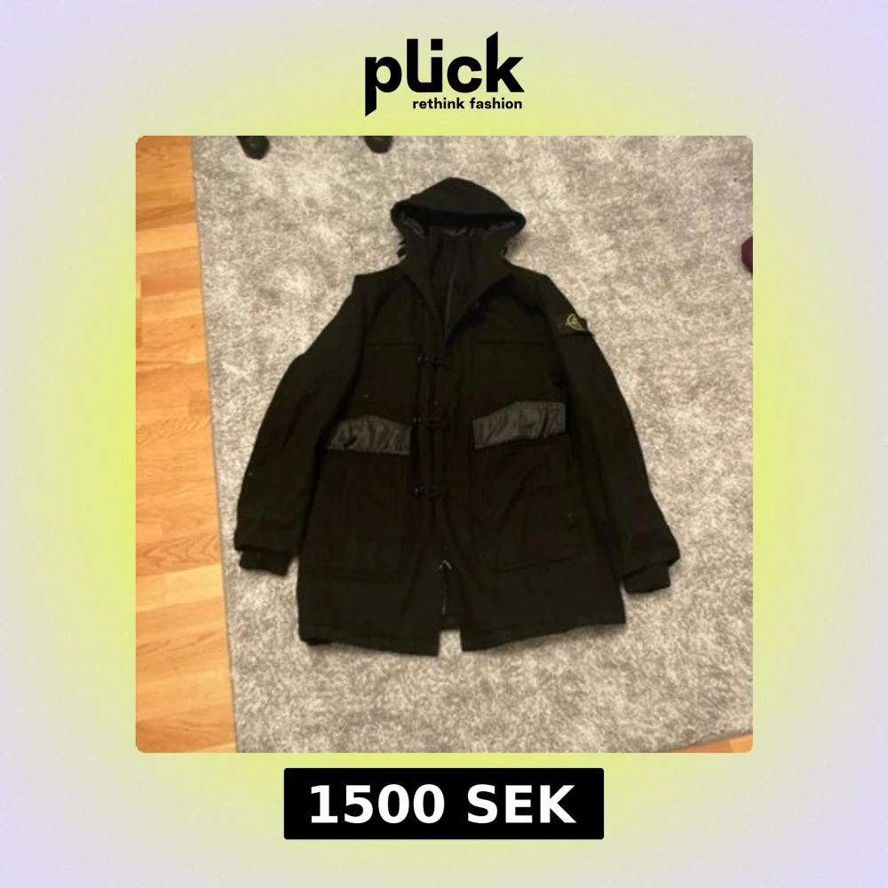 Säljer en svart rock från Stone Island med huva och quiltat foder. Jackan har långa ärmar och en klassisk design med knappar och dragkedja. Perfekt för kyligare dagar. Storlek S-M
