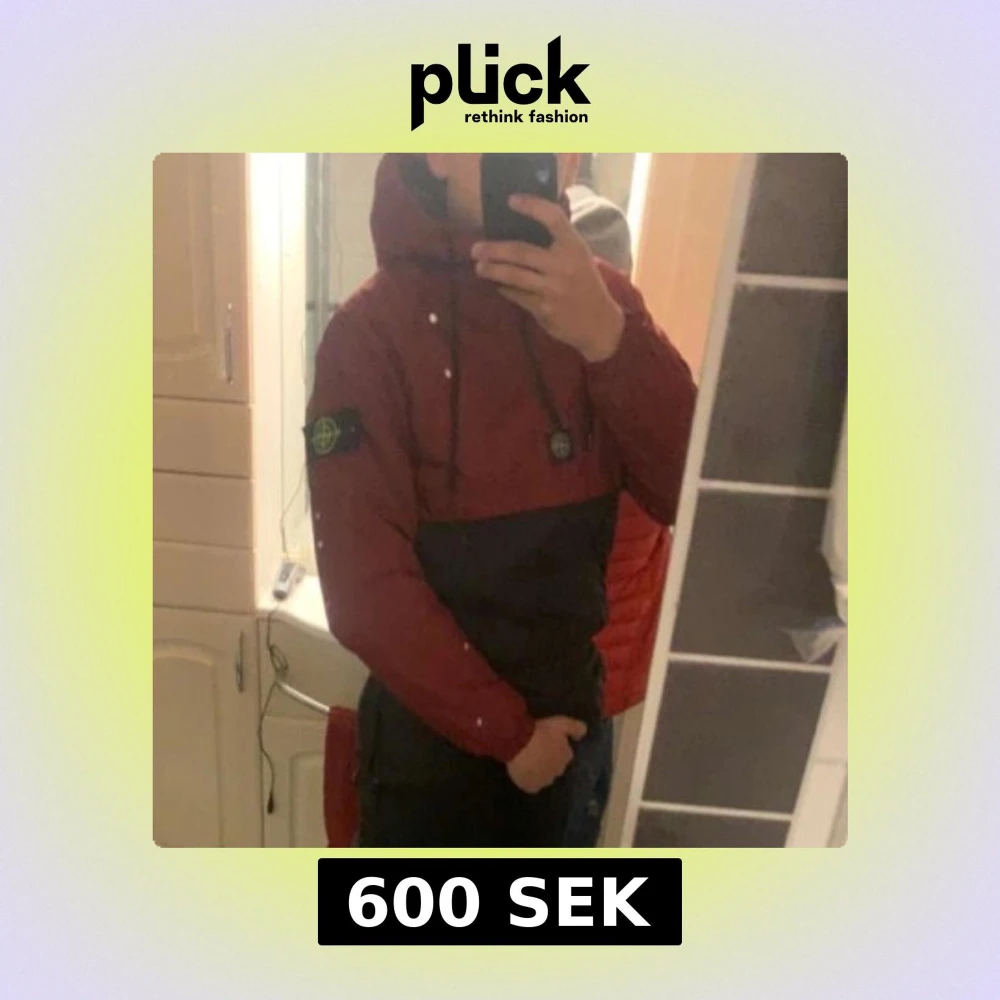 Säljer en snygg tvåfärgad vindjacka från Stone Island med huva och snörning. Jackan är röd upptill och svart nedtill, har lång ärm och klassisk patch på vänster arm. Perfekt för dig som vill ha streetstyle med ikonisk look.