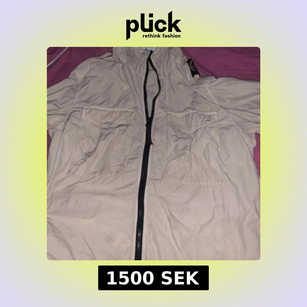 Säljer en beige jacka från Stone Island med dragkedja och två stora fickor framtill. Jackan har en klassisk design med en broderad logotyp på ärmen. Perfekt för en stilren look.