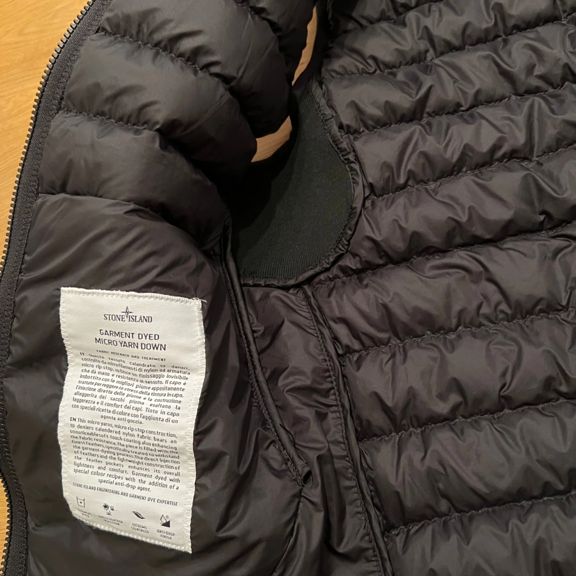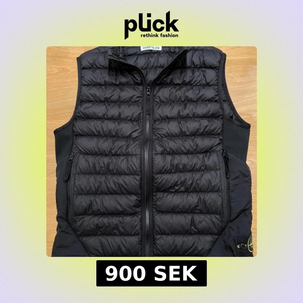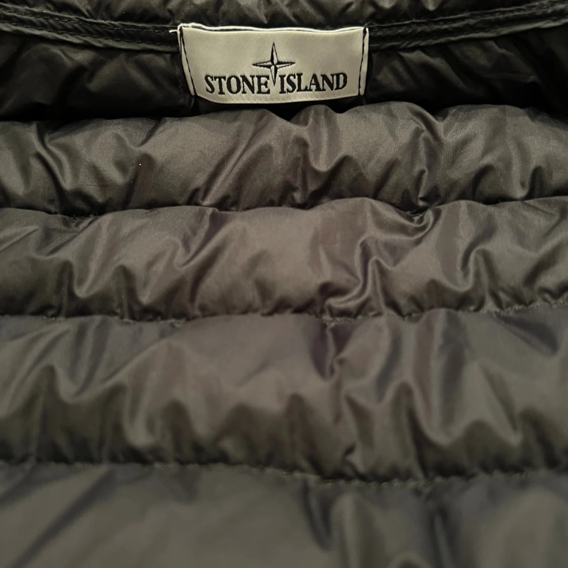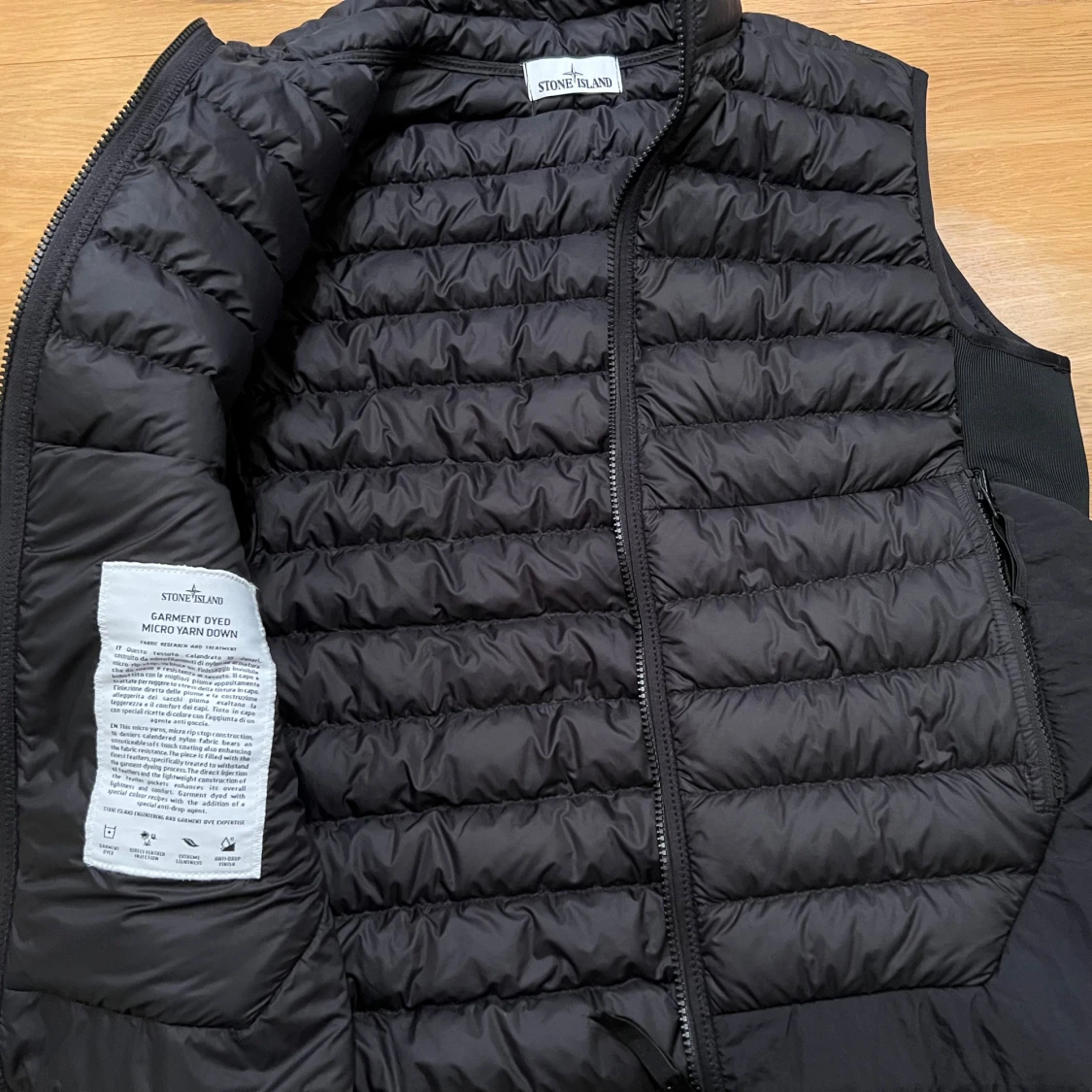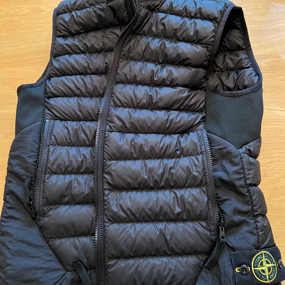 Säljer en svart dunväst från Stone Island med quiltad design och dragkedja framtill. Västen har två fickor med dragkedja och klassisk logotyp på sidan. Tillverkad i syntetmaterial och dun, perfekt för lager-på-lager-stil. Storleken är medium.