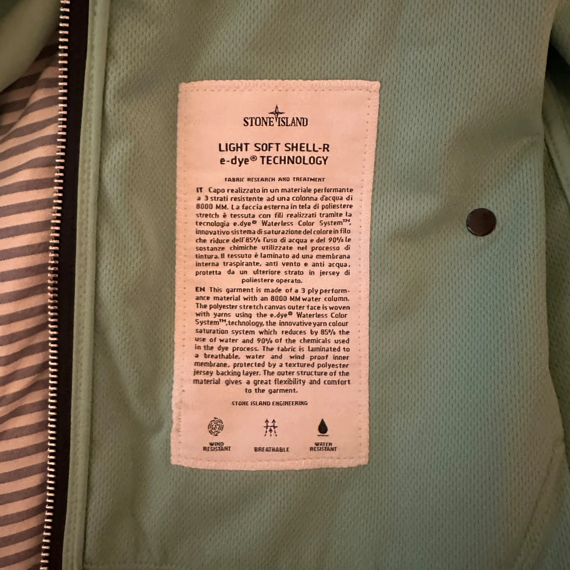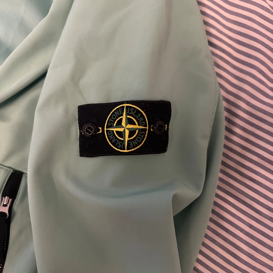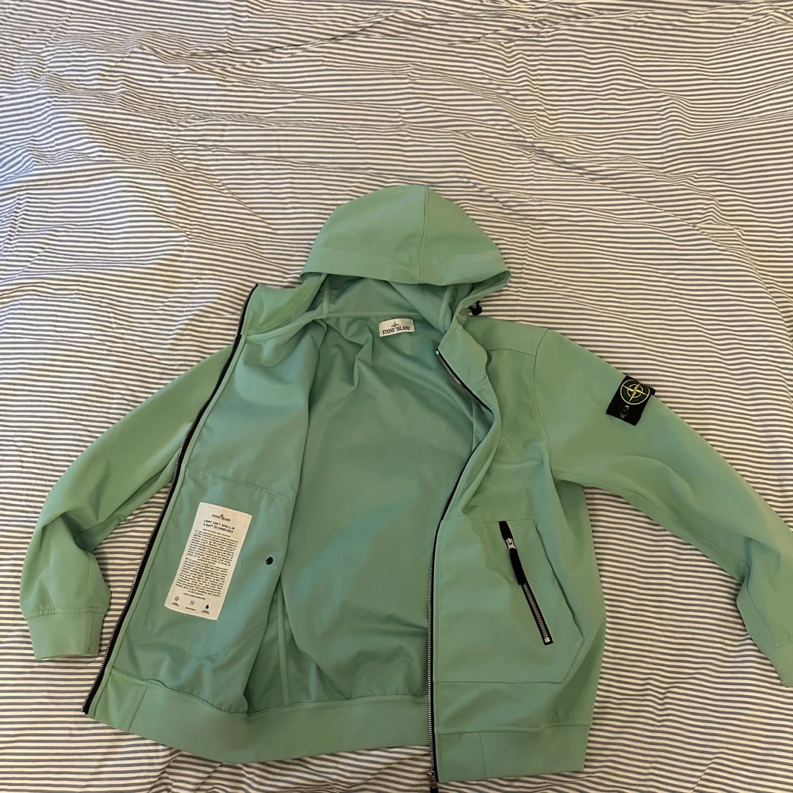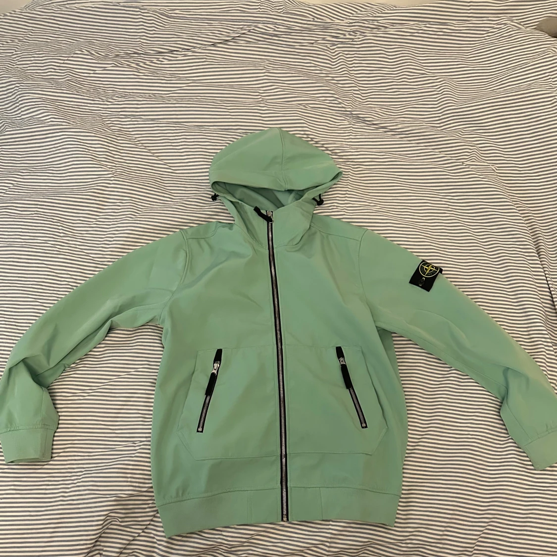 Mintgrön softshelljacka från Stone Island med huva och svarta dragkedjor. Jackan har klassisk patch på ärmen och är tillverkad i stretchig polyester med vindtät och vattenavvisande teknologi. Perfekt för dig som vill ha en clean och sportig look.