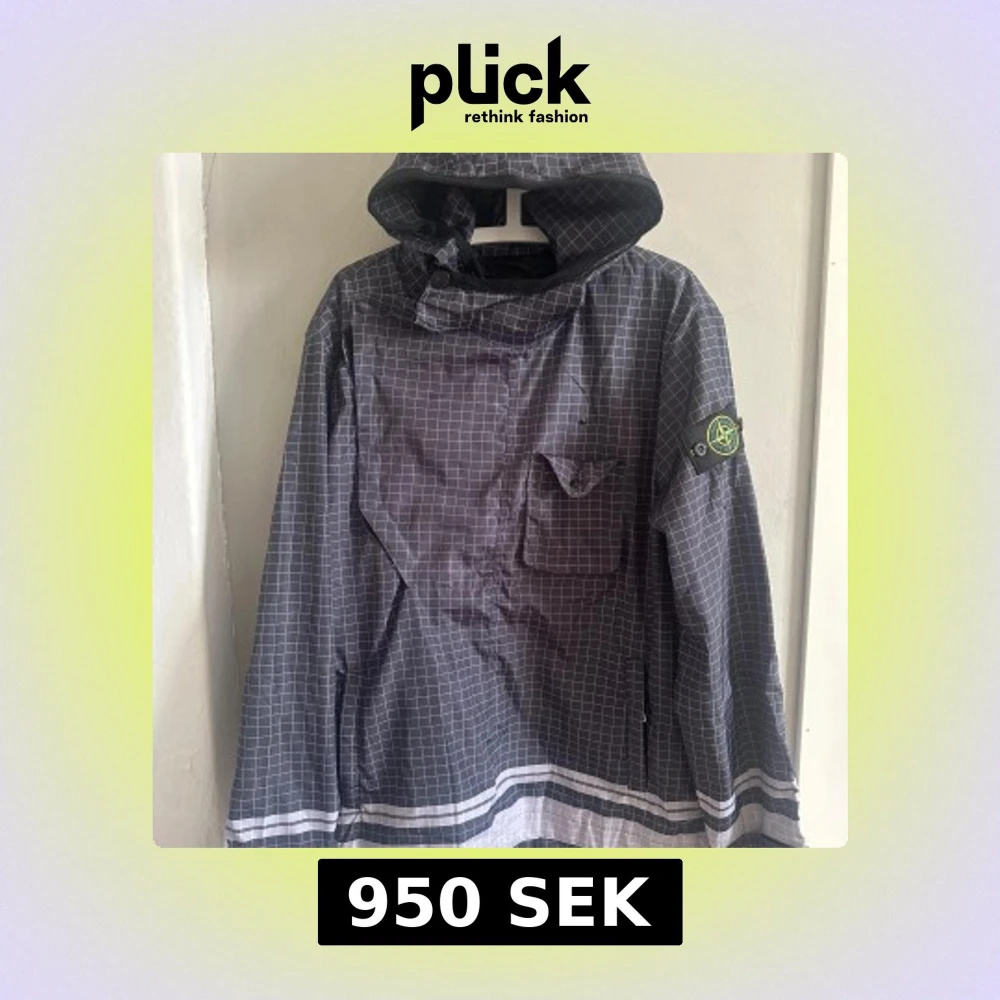 Säljer en grå vindjacka från Stone Island med vitt / reflex rutmönster och huva. Jackan har en bröstficka med lock, klassisk Stone Island-logga på ärmen och tryckt logga på ryggen. Perfekt för dig som gillar streetwear och snygga detaljer.