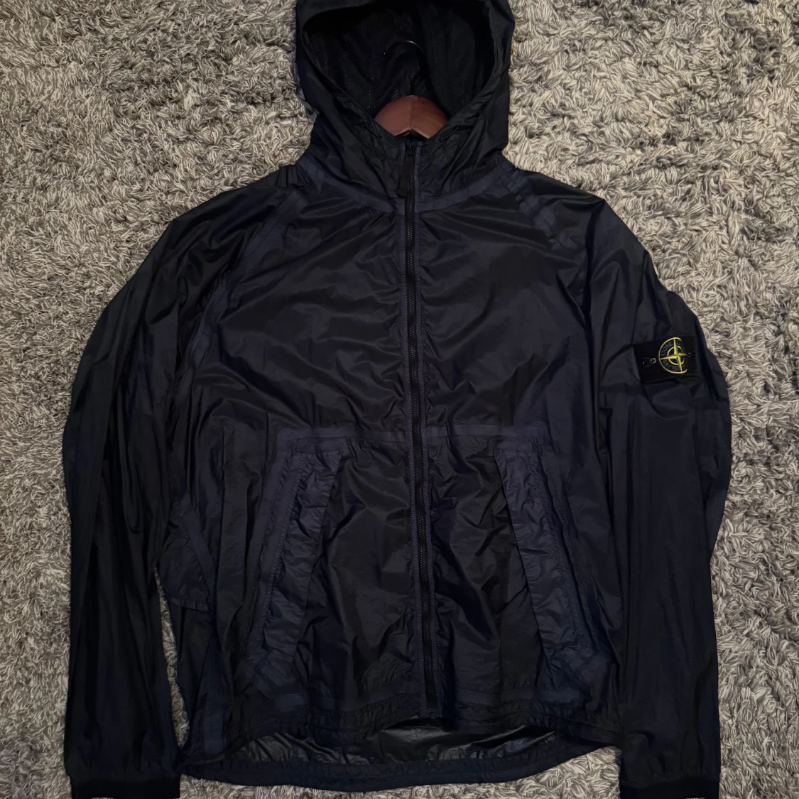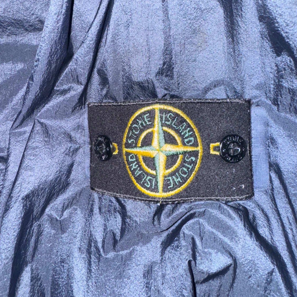 Säljer en svart vindjacka från Stone Island med huva och dragkedja. Jackan har en ikonisk logga på ärmen och är perfekt för blåsiga dagar. Den är tillverkad i ett lätt syntetmaterial och har långa ärmar. Pris kan diskuteras!