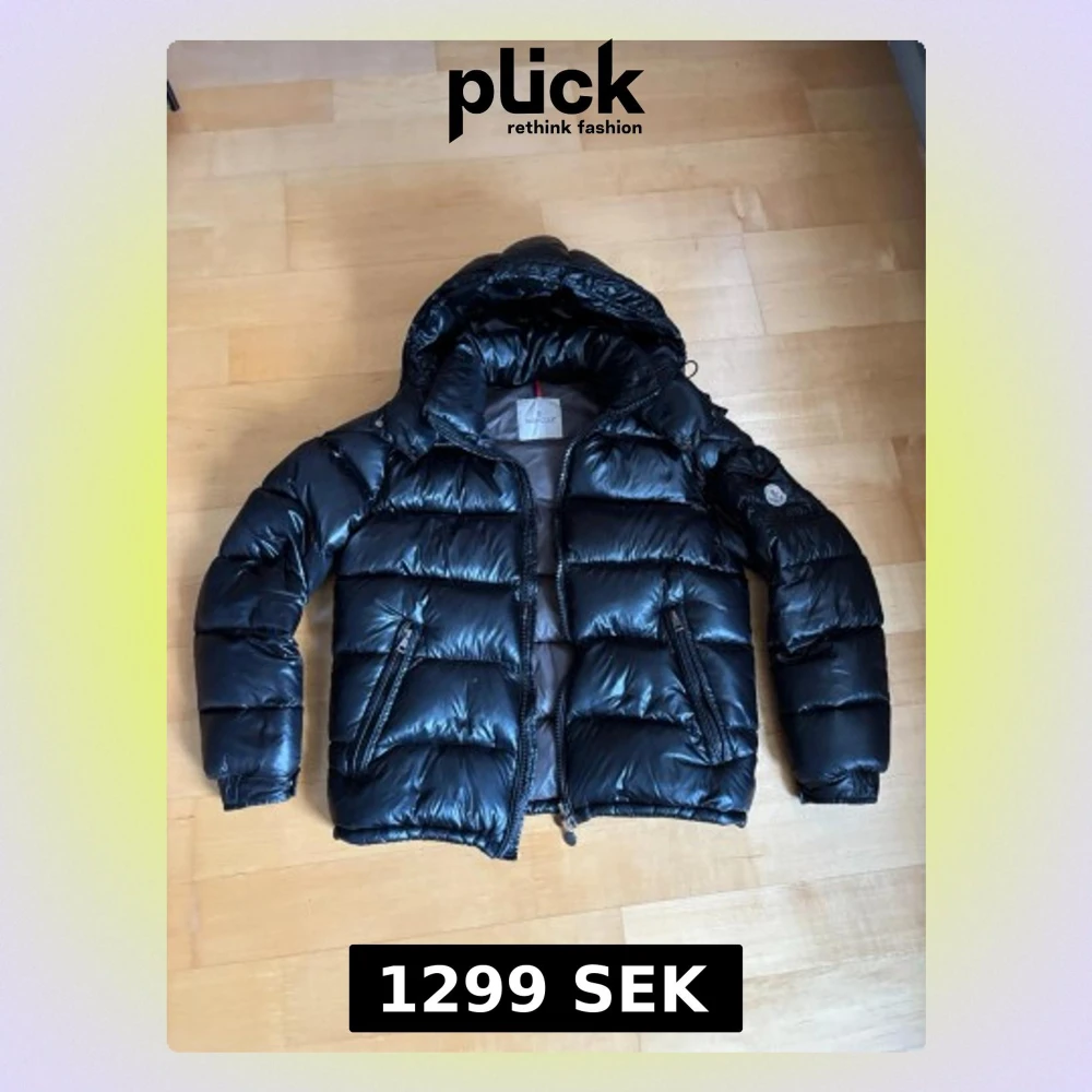 Säljer en svart pufferjacka från Moncler med glansig finish och huva. Jackan har dragkedja framtill, två snedställda fickor med dragkedja och en ficka med knapp på ärmen med Moncler-logga. Materialet är polyester och dun, perfekt för kalla dagar.