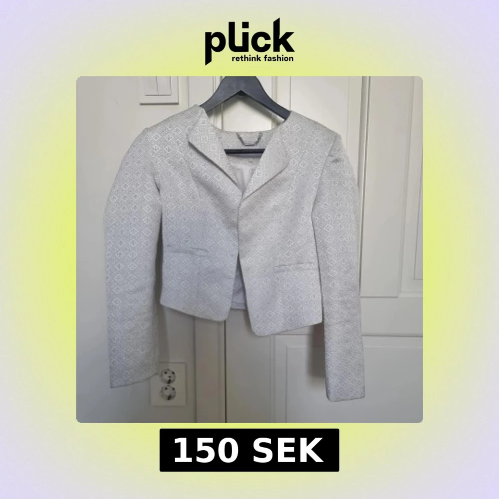 vit kavaj från Stockh LM med ett geometriskt mönster. Kavajen har en kort och är i storlek 36. Finns en gul fläck på insidan men syns inte så mycket. På ärmarna finns dragkedjor (se sista bilden)