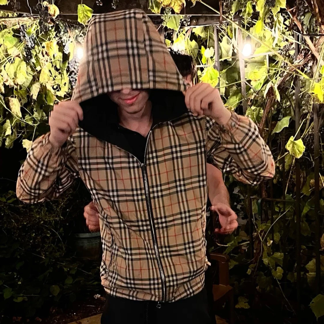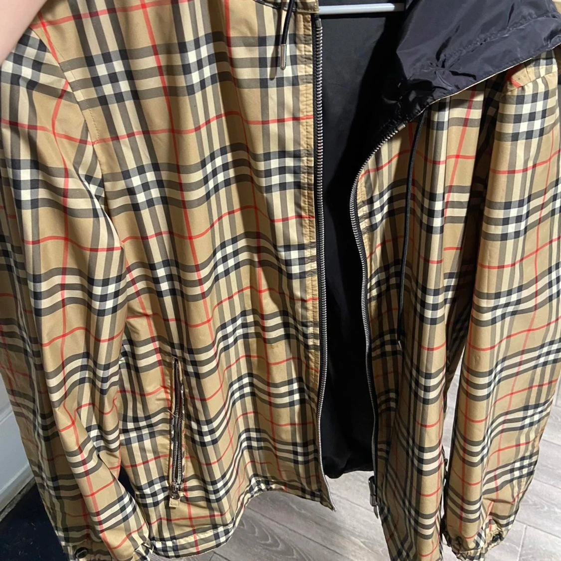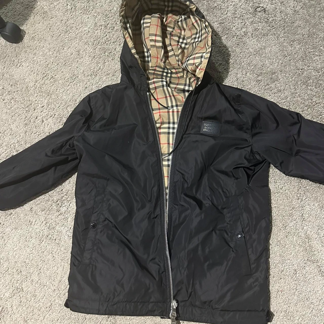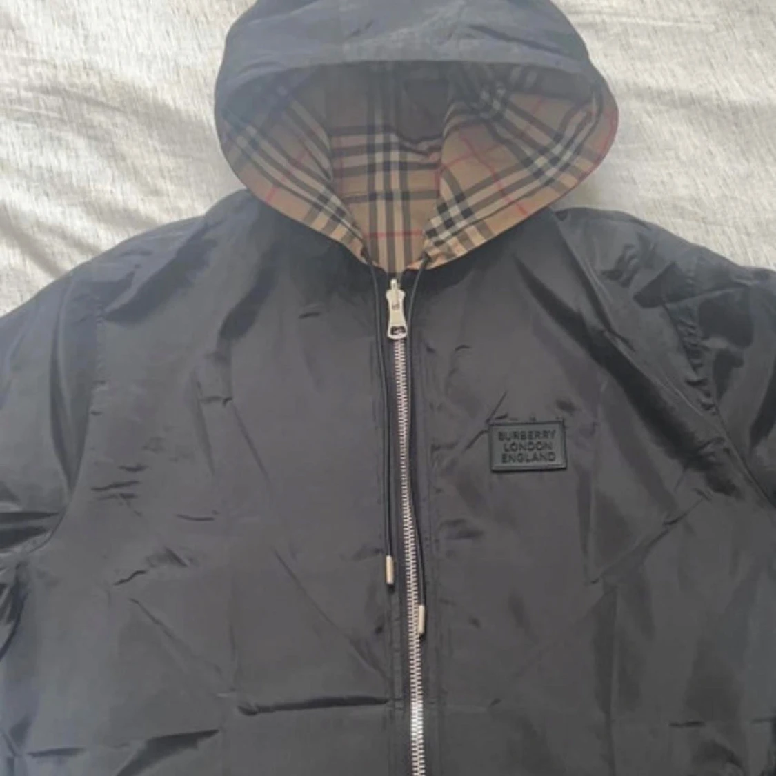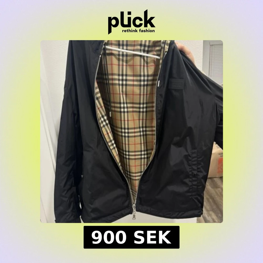 Snygg svart jacka från Burberry med klassiskt rutigt foder. Jackan har en dragkedja framtill och en huva för extra skydd. Perfekt för en stilren look. Skyddar från vind och regn