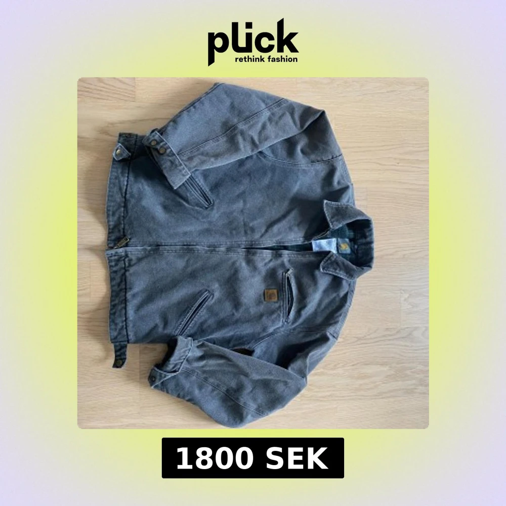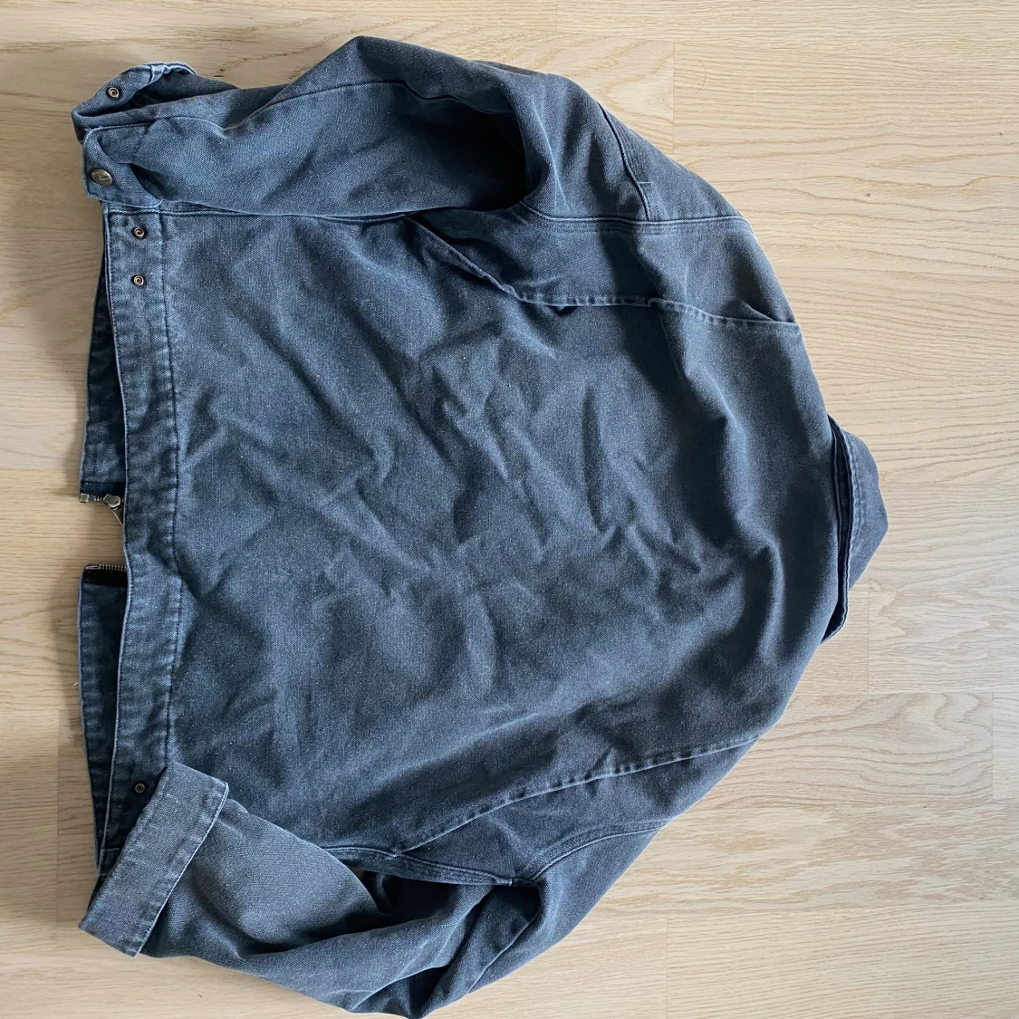 Säljer en grå workwear jacka från Carhartt med klassisk krage, dragkedja framtill och två snedställda fickor. Jackan har robust bomullsmaterial och detaljer med tryckknappar vid ärmslut och midja. Perfekt för dig som gillar streetwear och funktionell stil.