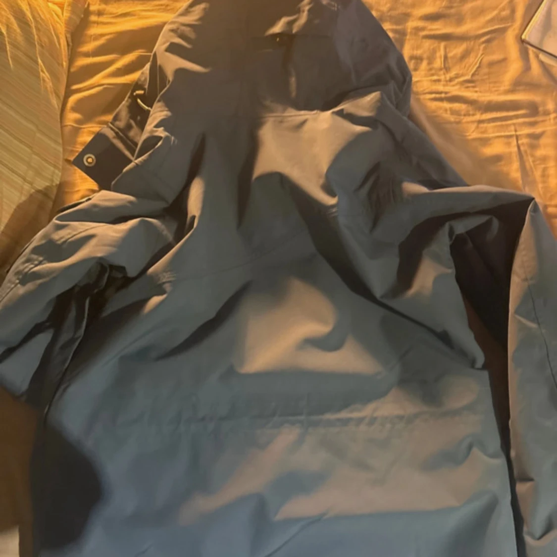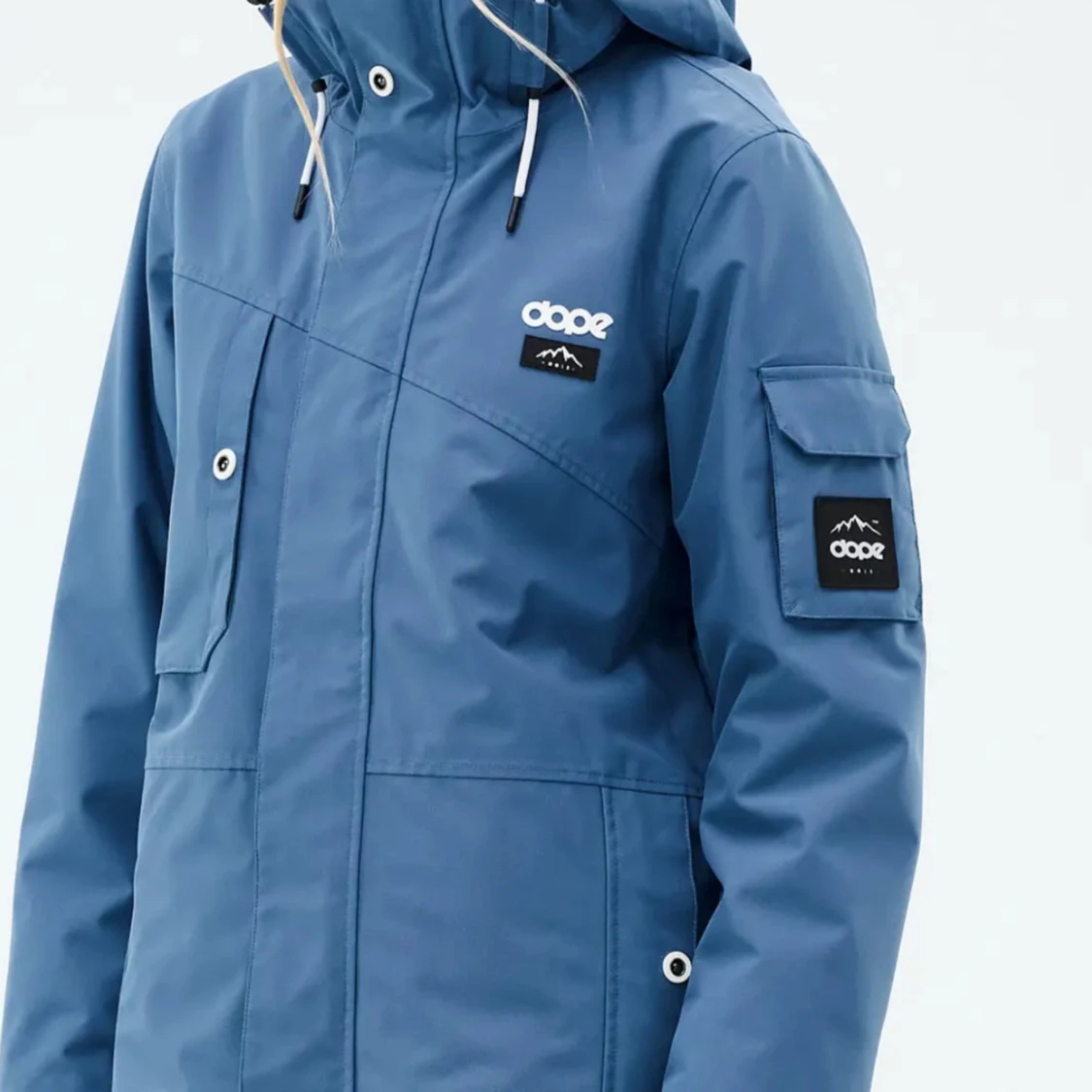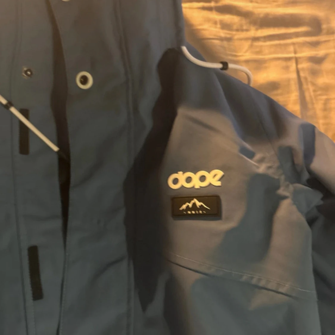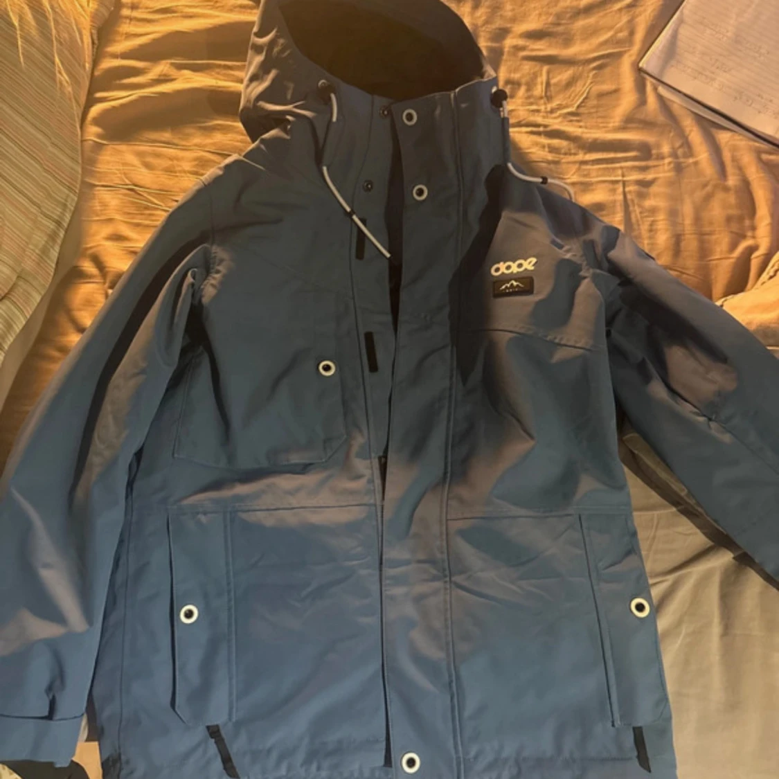 Säljer en blå skidjacka från Dope. Jackan har huva med snörning, flera fickor med dragkedja och coola metallöglor. Perfekt för dig som gillar streetwear och outdoor-vibe. Använd enbart två gånger så i bra skick, den är mellanfodrad.