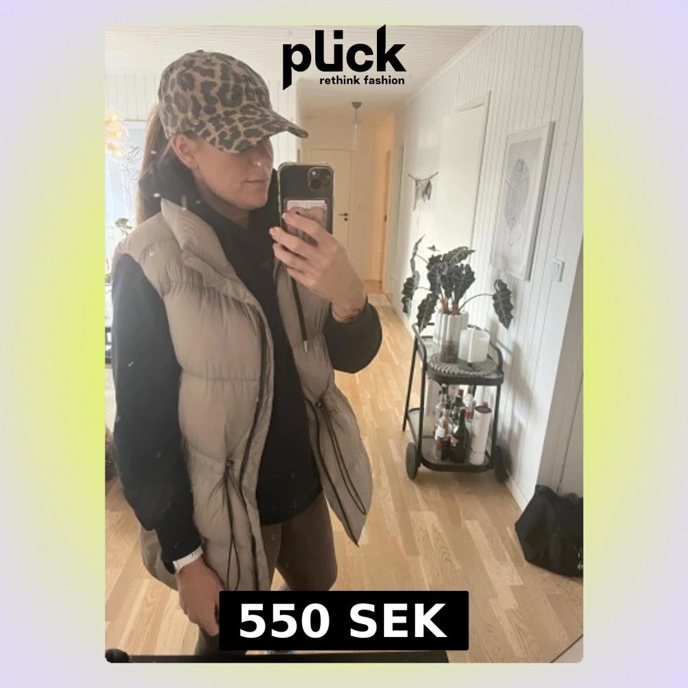 Säljer en beige dunväst från Stronger med hög krage och svarta dragskor i midjan. Västen har quiltad design och dragkedja framtill. Perfekt att slänga över en hoodie för en chill look.