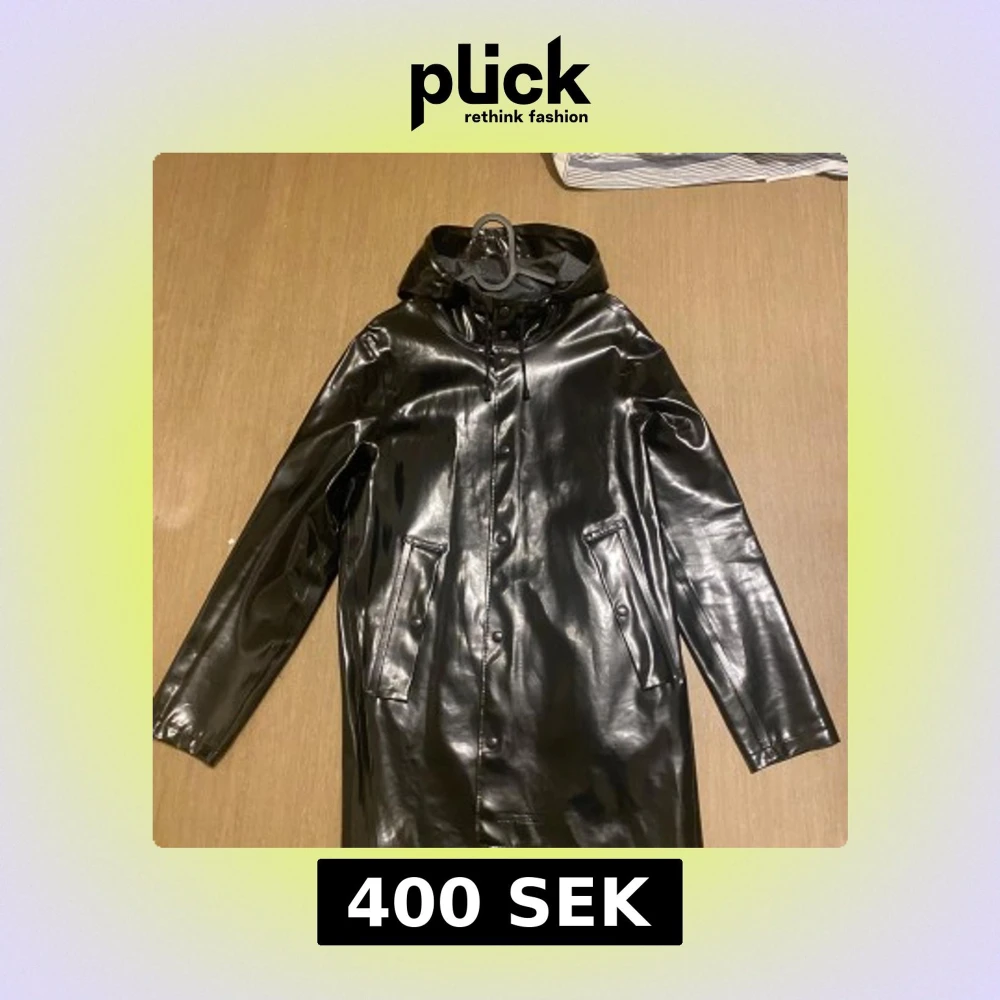 Snygg svart regnjacka från Stutterheim med huva och knappar framtill. Jackan är glansig som gör även att jackan är väldigt unik. Storleken är xxs men passa som xs eftersom de är stora i storlek.