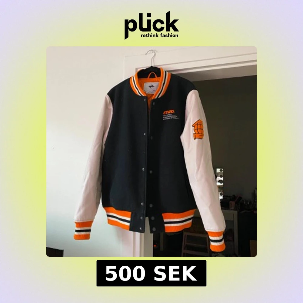Snygg svart och vit varsity jacka från pull & bear i storlek M. Jackan har långa vita ärmar och svart kropp med broderade logotyper på bröstet och ryggen. Den har knappar framtill och ribbade muddar i orange, svart och vitt. Använd men i väldigt bra skick.