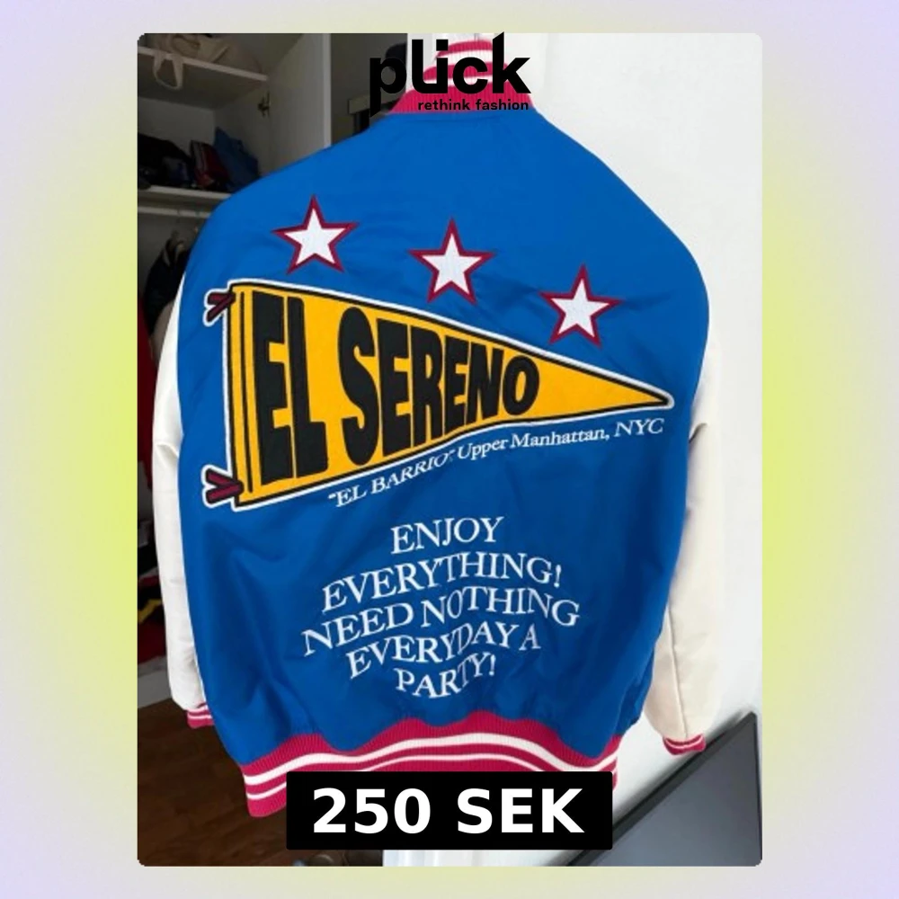 Snygg blå och vit bomberjacka från El Sereno med stora tryck och broderade detaljer på både fram- och baksida. Jackan har röda och vita ribbade muddar, tryckknappar och coola patches med text och stjärnor. Perfekt statement-plagg för dig som vill sticka ut.