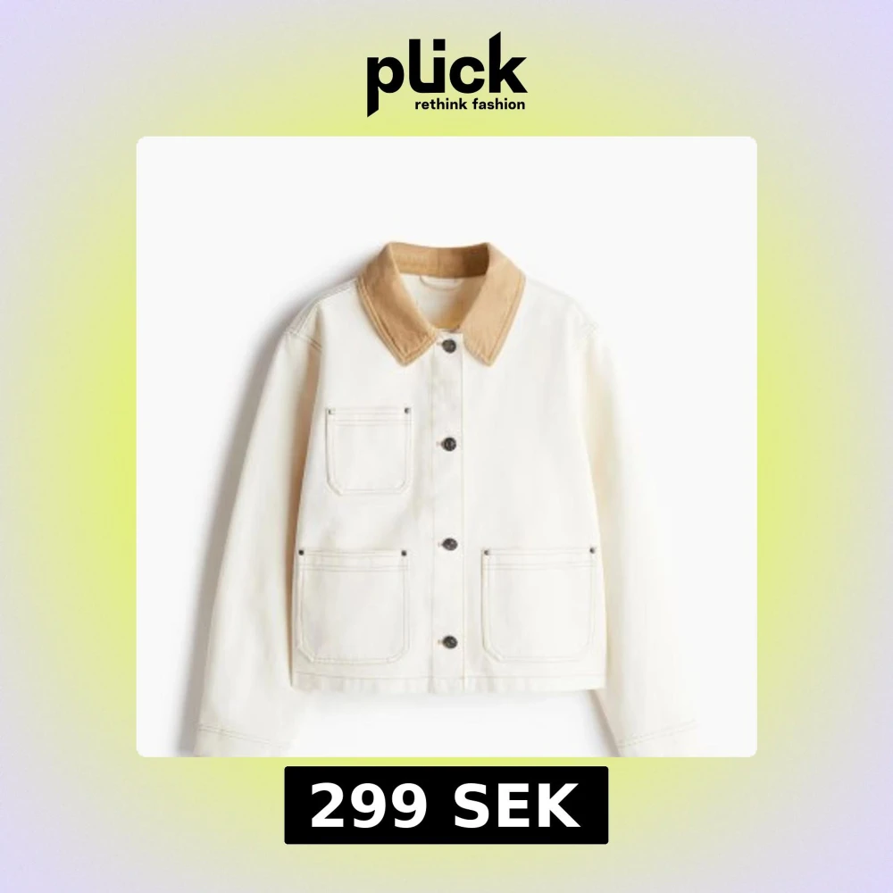 Jacka från H&M i bomullsdenim kontrasterande krage i ljusbrun manchester. Jackan har tre stora fickor framtill, knappar hela vägen och raka ärmar. Jättefin! Aldrig använd bara testad. Storlek small. Slutsåld på h&m , köptes för 499kr