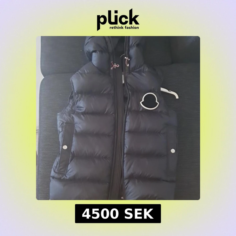 Svart dunväst från Moncler, modell Vanoise Gilet. Västen har en hög krage, huva med snörning och två fickor med tryckknappar. Moncler-logga på bröstet och dragkedja framtill. Priset kan diskuteras.