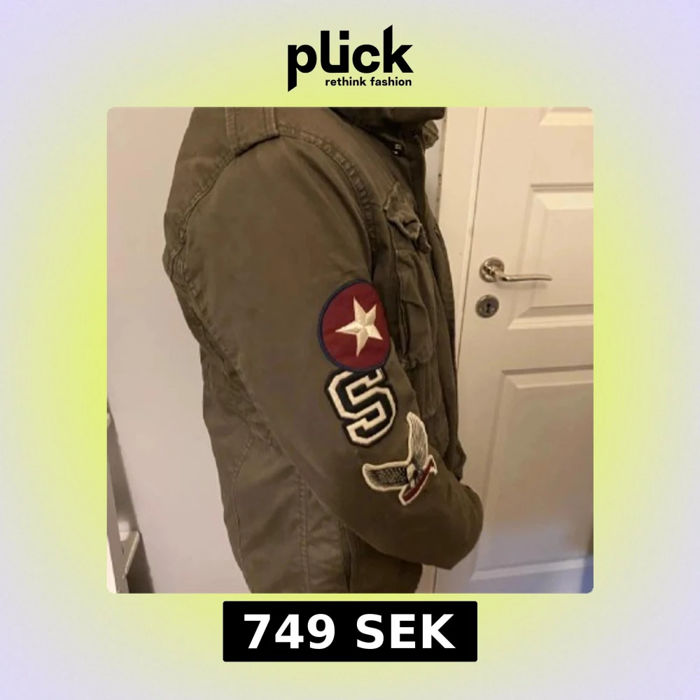 Säljer en olivgrön fieldjacket från Superdry med flera coola broderade patches på ärmarna och bröstet. Jackan har fyra stora fickor framtill, hög krage och dragkedja.