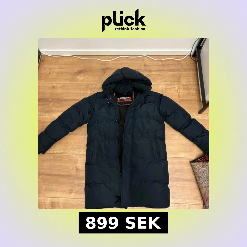 Säljer en mörkblå helt Ny Oanvänt lång pufferjacka från Superdry med huva och broderad logga på ärmen. Jackan har dragkedja framtill, två sidofickor och är fodrad med svart innerfoder. Perfekt för kalla dagar och har en clean, sportig look.