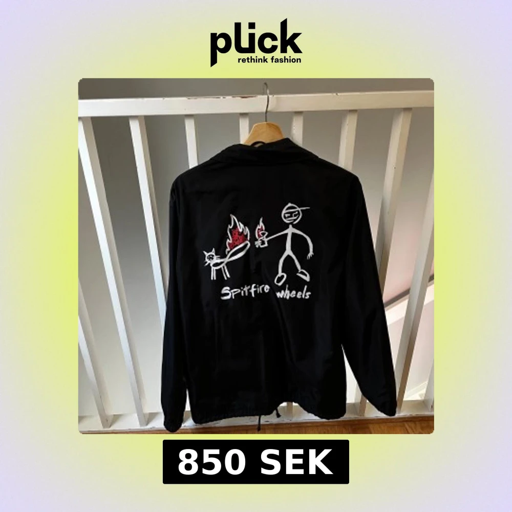 Svart coachjacka från Supreme i samarbete med Spitfire Wheels. Jackan har tryckknappar, snörning i midjan och ett stort grafiskt tryck på ryggen med stickman och eld. Framsidan har Supreme x Spitfire-logga. Yttermaterial i polyester, fodrad med bomull och polyester.